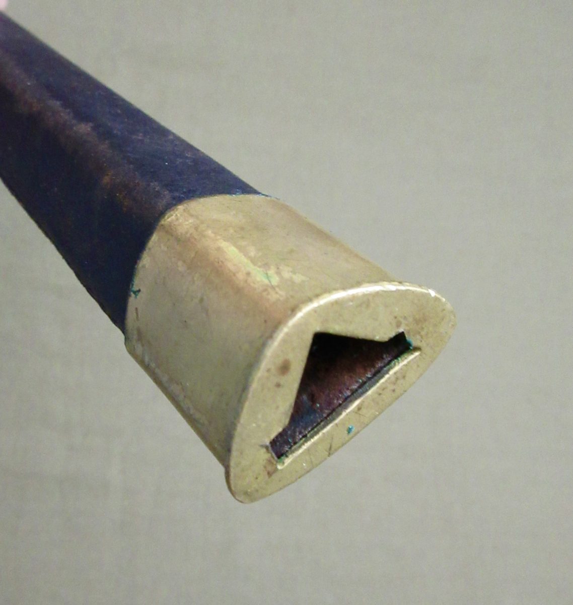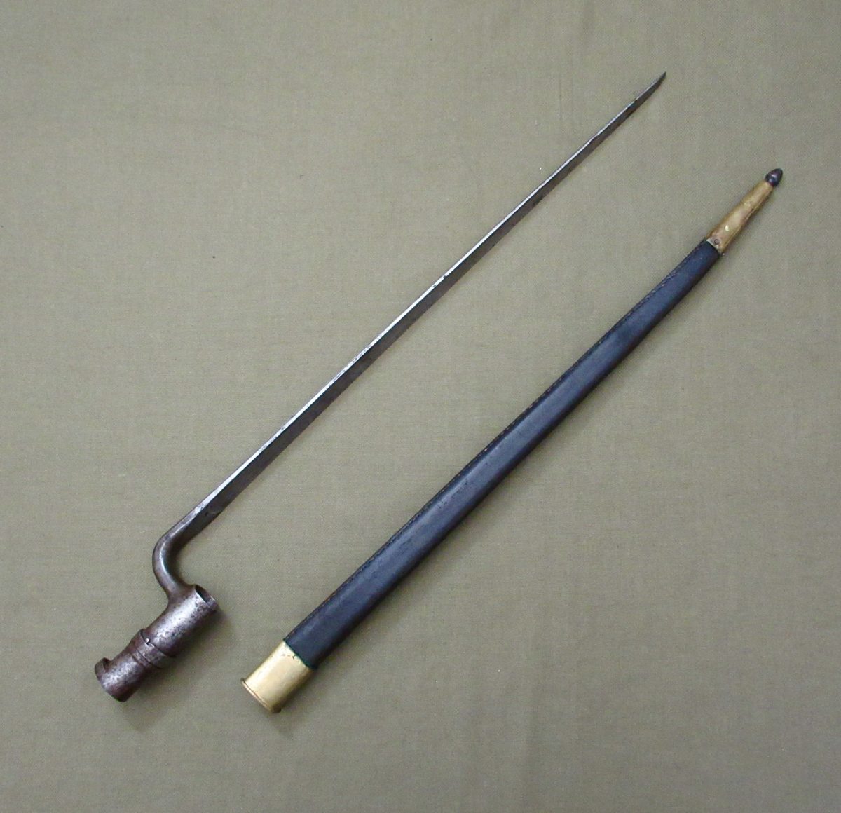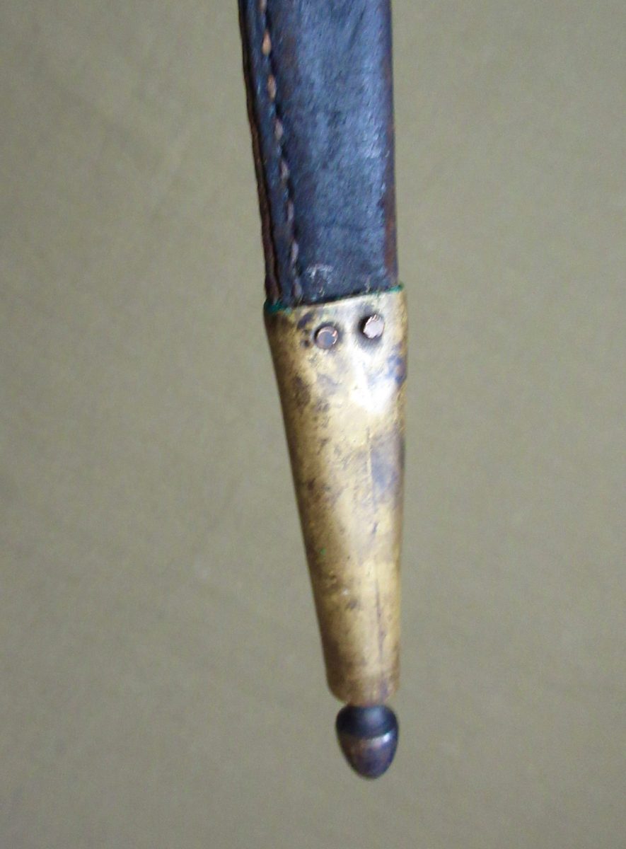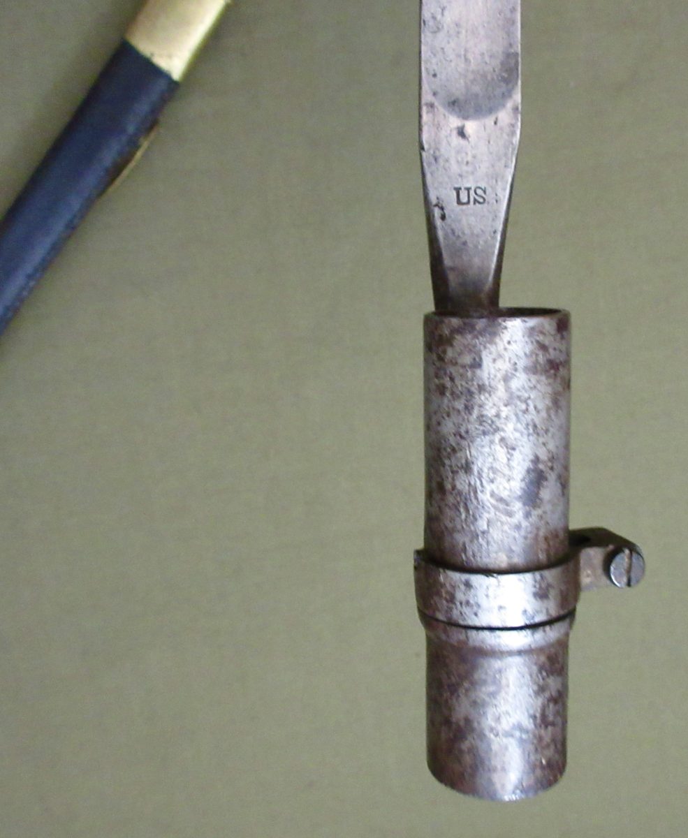 The bayonet has been modified from use with the Enfield bayonet, to now except the standard Federal Model 1855 bayonet. This was done by cutting the slot on the brass throat to accommodate the ’55 pattern shape. As the brass finial is a standard Federal pattern which appears to be a period addition. The scabbard worn on the belt with the British pattern frog.