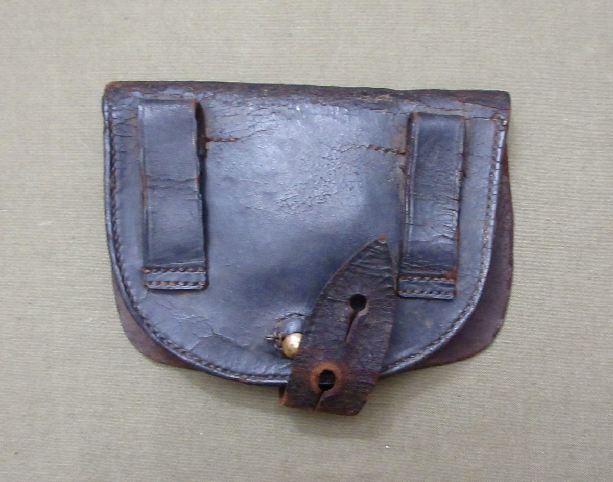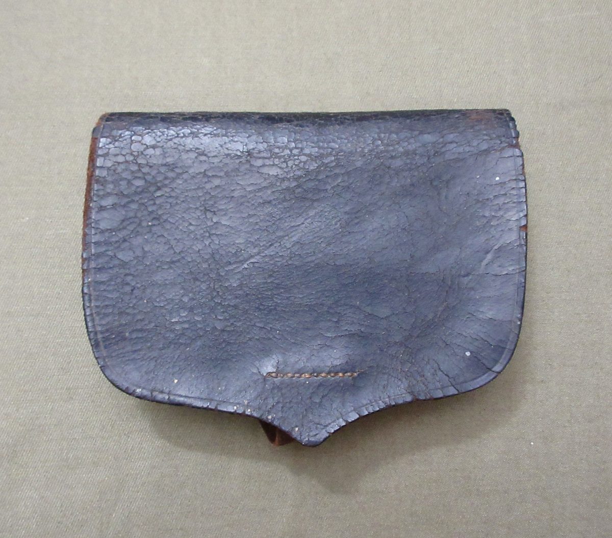 This pouch is called a cap and waiting pouch, which had a small inner pouch for caps, and a front pocket large enough to hold 10 paper cartridges for quick access when needed, being much more readily accessible than using the larger standard cartridge box. There are no markings on the piece.