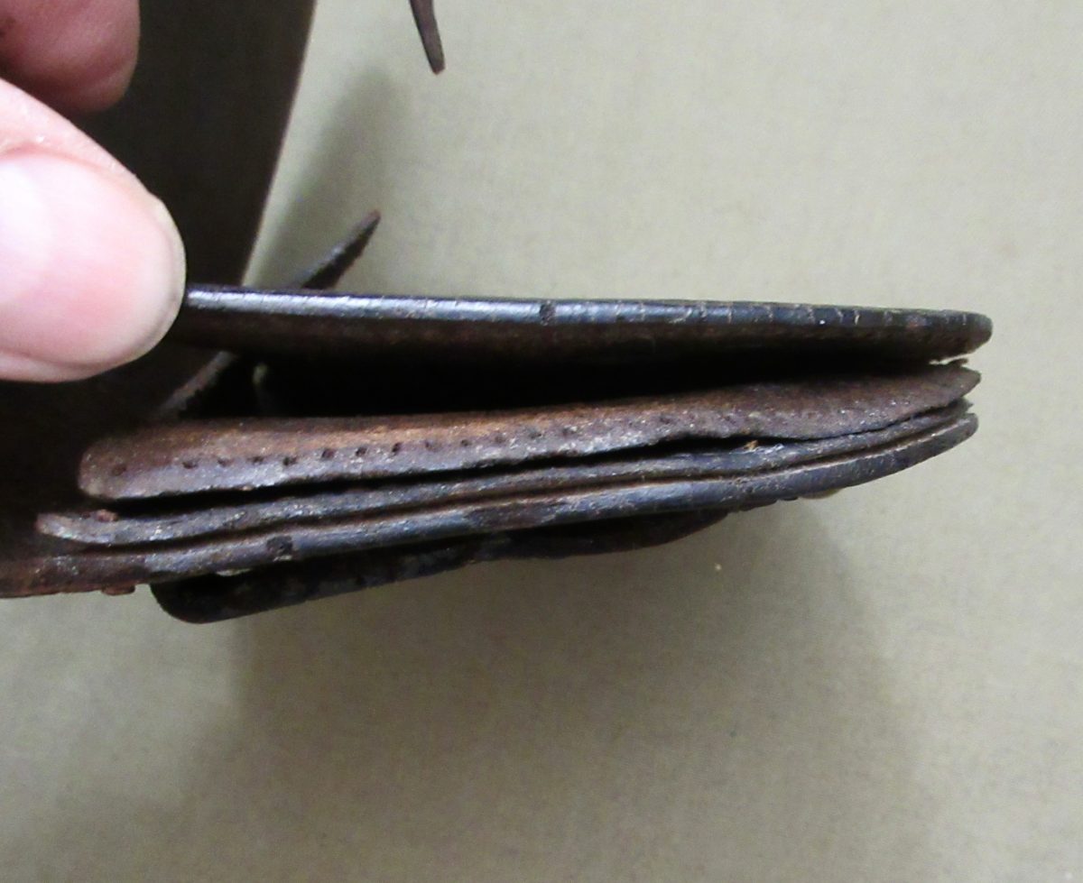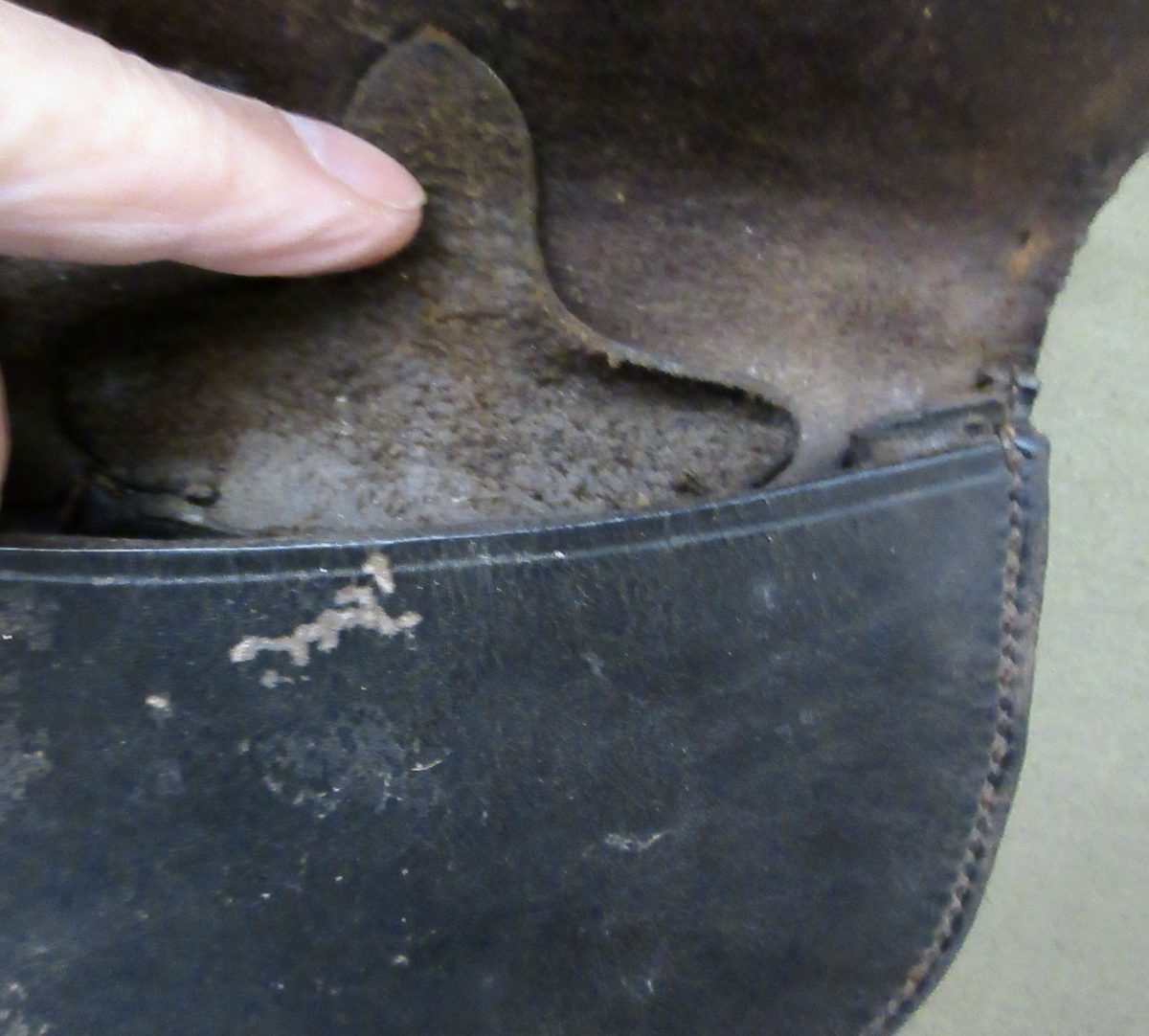 The flap is 6 inches wide over a rounded pouch. Stitching on the left side has popped, but easily repaired if so desired. Fine for display as is. Some crackled leather on surfaces and overall in very good condition.