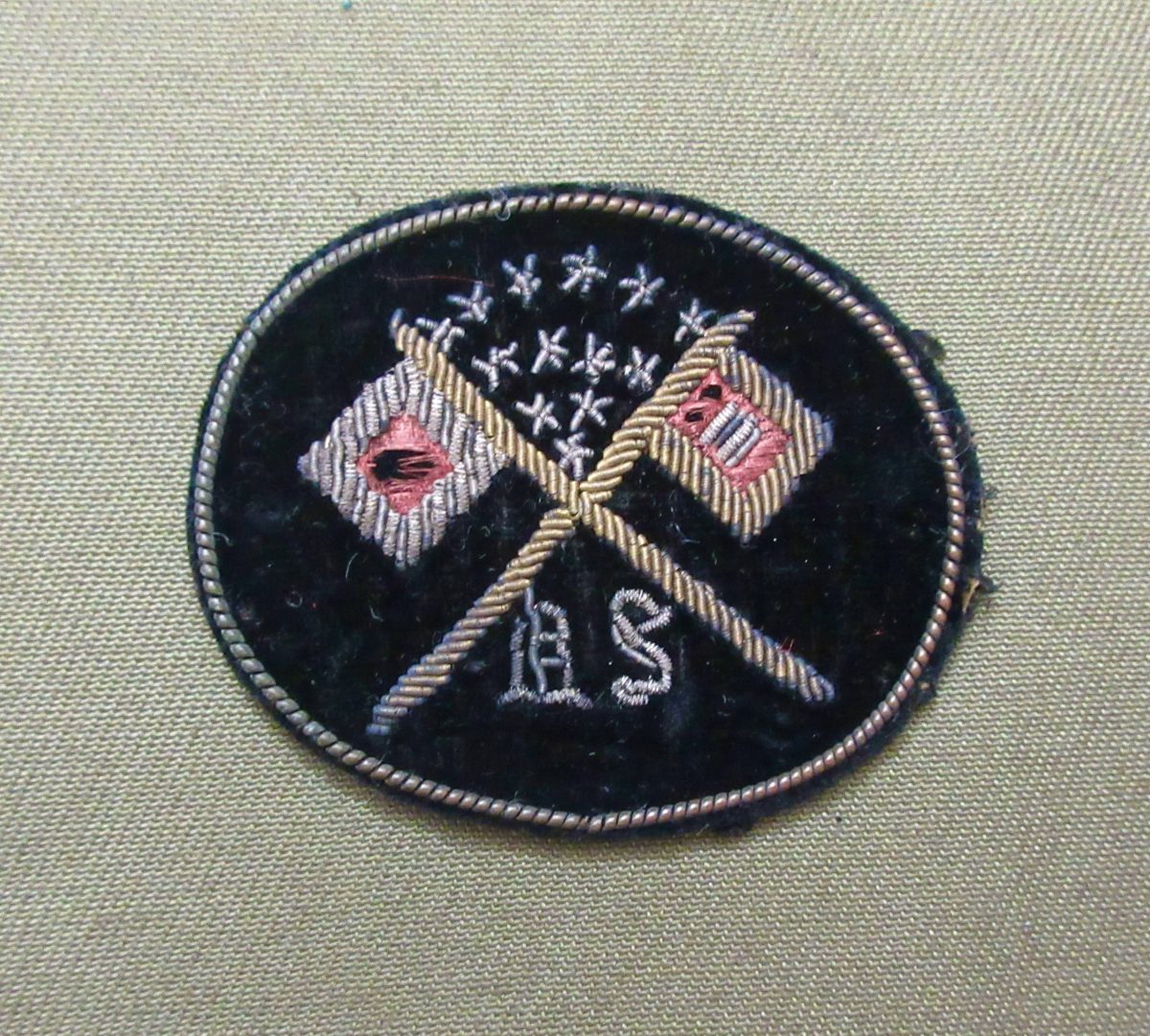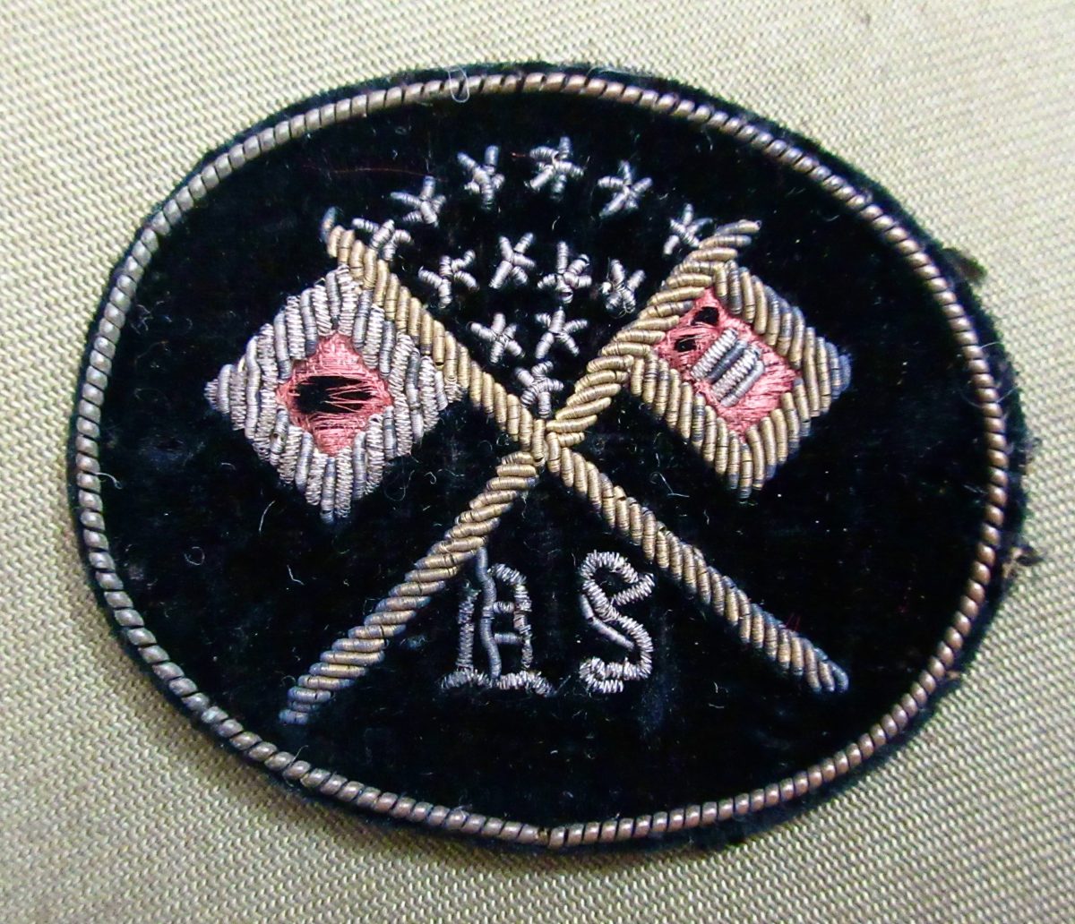 Civil War Era Signal Officer’s Forage Cap Bullion Insignia. This is another scarce insignia made with gold and silver bullion thread on black velvet. The signal flags have red silk centers with one embellished with two narrow lines of silver bullion. The stars and US are in silver as well, finished with a fine twist of gilt wire sewn to the perimeter.