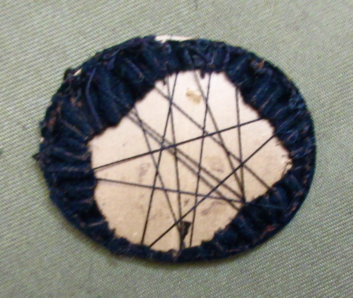 the velvet wraps around a piece of stiff paper and treaded in a criss-cross method to hole it in place. Some stress lines on the silk.