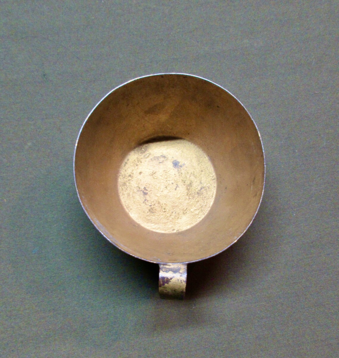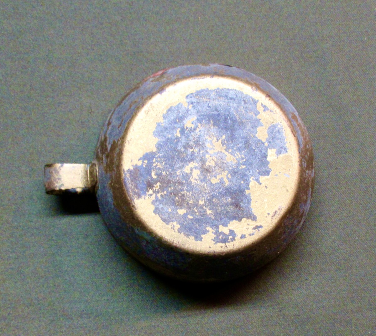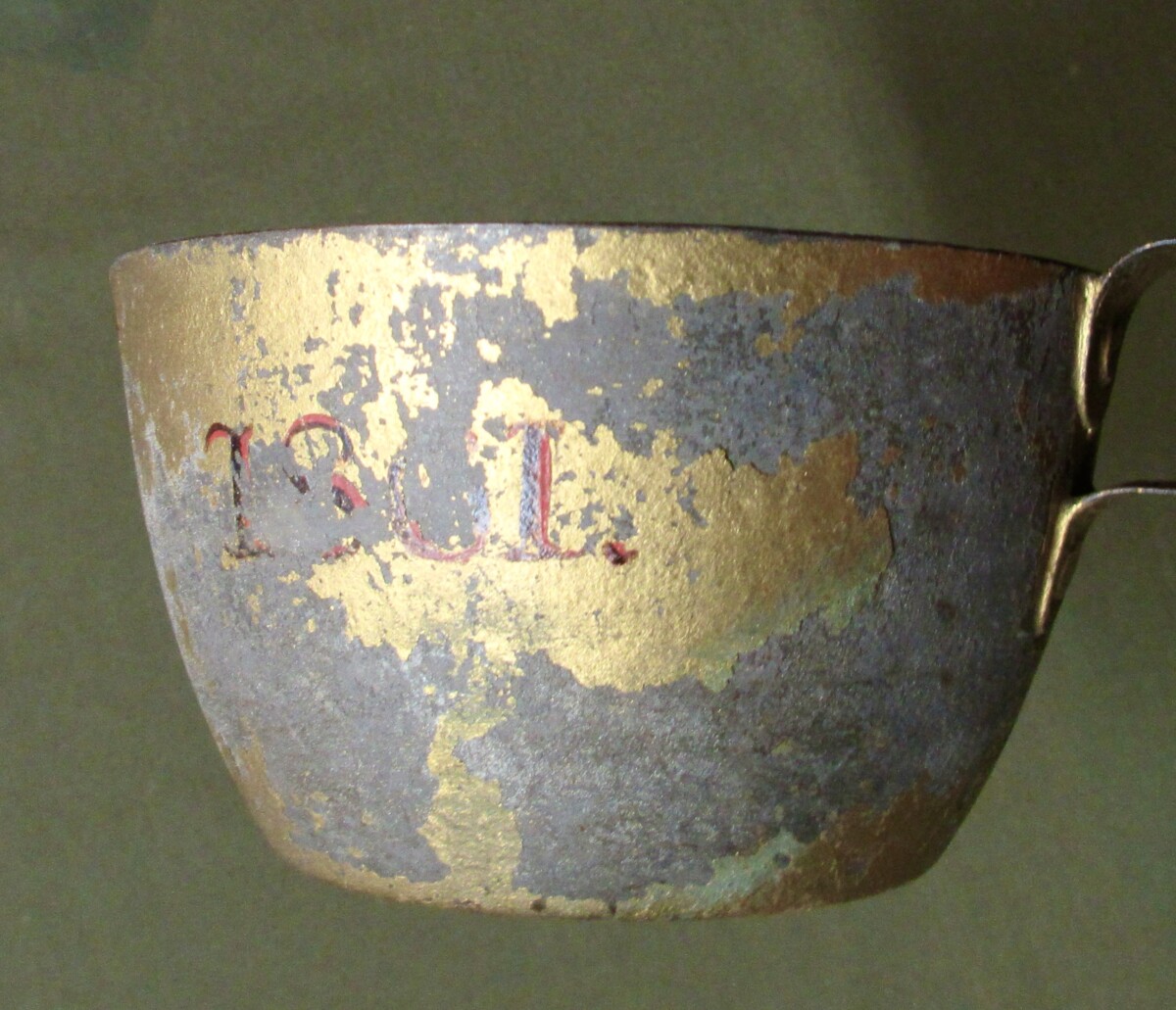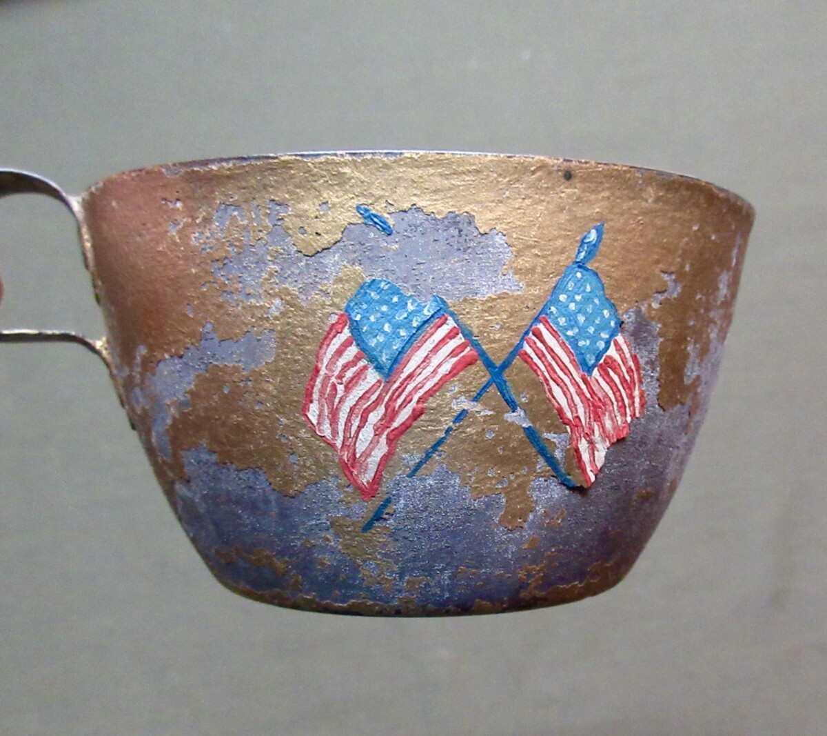 Civil War State Contract – Id’d Mix & Co Drinking Cup. This cup was displayed in a G.A.R. hall at some point, the gift of Private Frederick B.St. John, Co, “I,” 34th N.Y. Volunteer Infantry. The cup was painted in gold and has the date 1861 on one side and crossed U.S. flags on the opposite side.