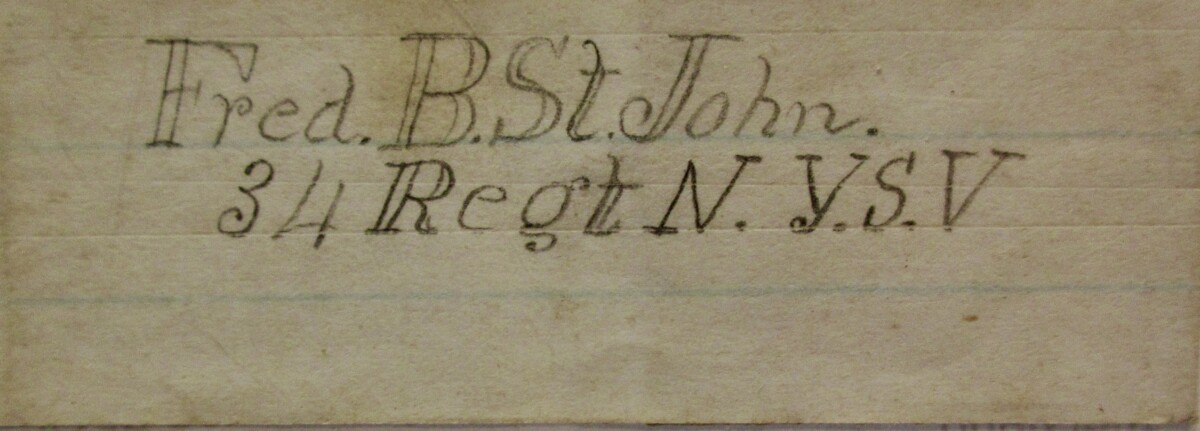 Private St. John served in the 34th NY Vols. from June 15, 1861 to August 1. 1861, He reportedly deserted at Great Falls, Maryland.