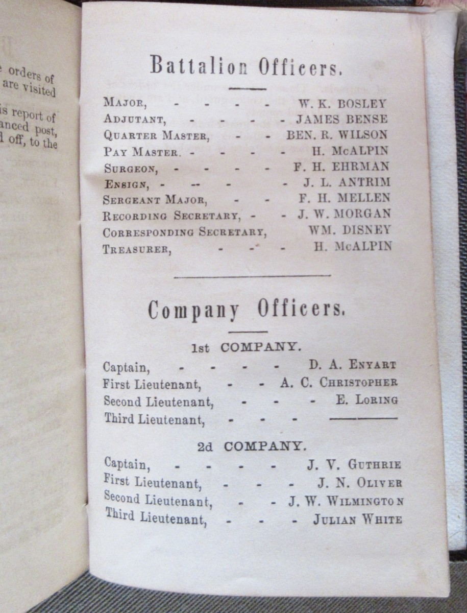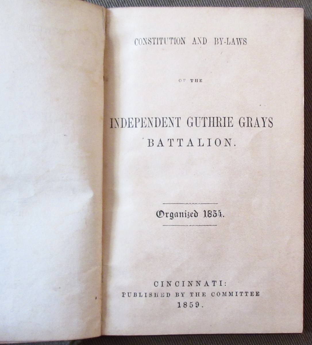 Constitution And By-Laws of the Independent Guthrie Grays Battalion, Organized 1854, Cincinnati: Published by the Committee, 1859.  Small format, hard cloth embossed covers with gilt “I.G.G.”   60 pages, (additional page in rear list officers of the unit).