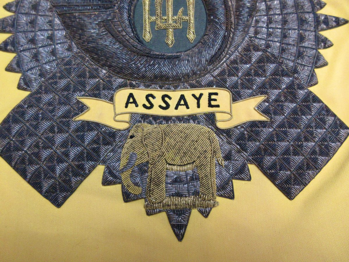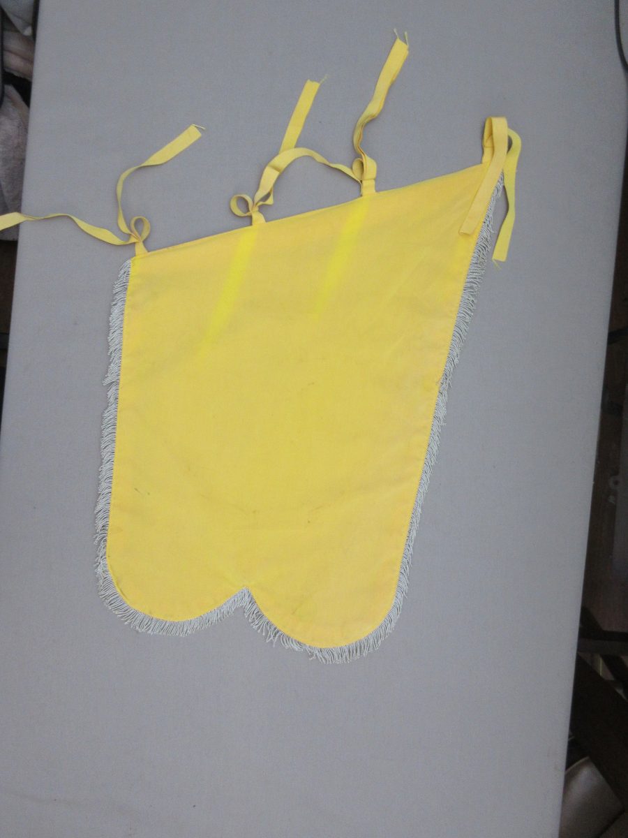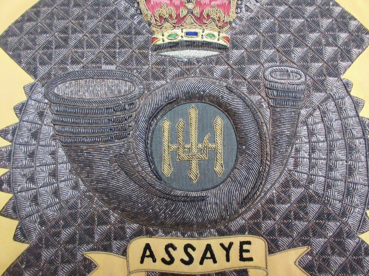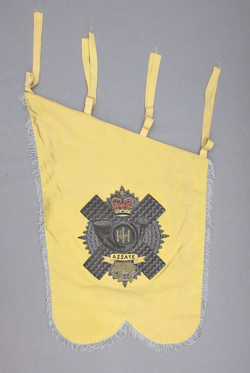 Elizabeth II Era Highland Light Infantry Bag Pipe Banner. Fine embroidery on yellow satin. with 4 loop for attaching to hanging rod, or other.