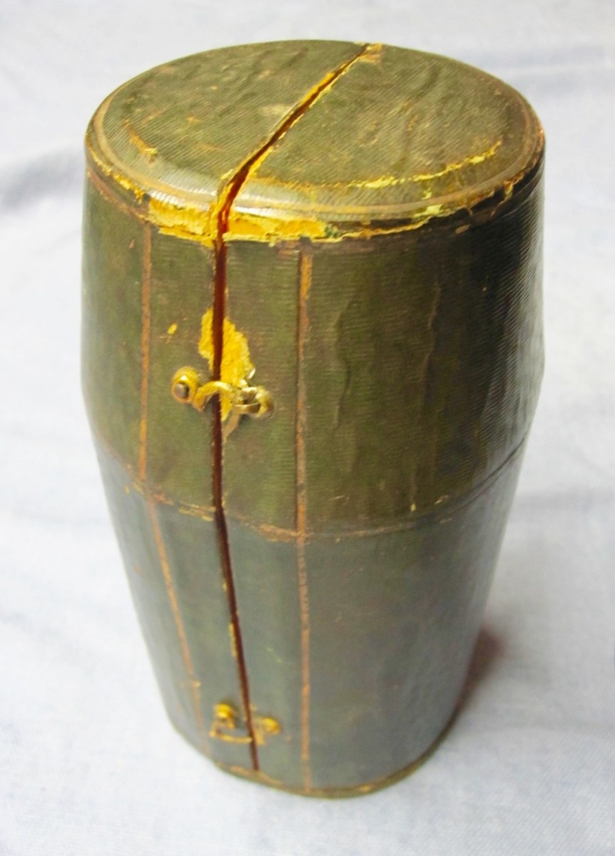 The kit is 6 ¼” tall, is made of wood, covered in green Moroccan leather accented with gilt. Two brass hook and eye closures are still mounted in place. The interior is finished with chamois. The interior contains a chamois covered cylinder, trimmed in red, that holds the utensils; Knife, Fork, and Spoon, with their screw-off handles, each engraved with the original owners initials, “JM.” A center cylinder, showing heavy patina, is a two section condiment container. There is one slot left open for another small knife blade that is missing from the set. Also missing is the glass tumbler that this chamois covered cylinder would have been placed in. I have come close several times to finding a fit, but leave that hunt to the next happy owner.