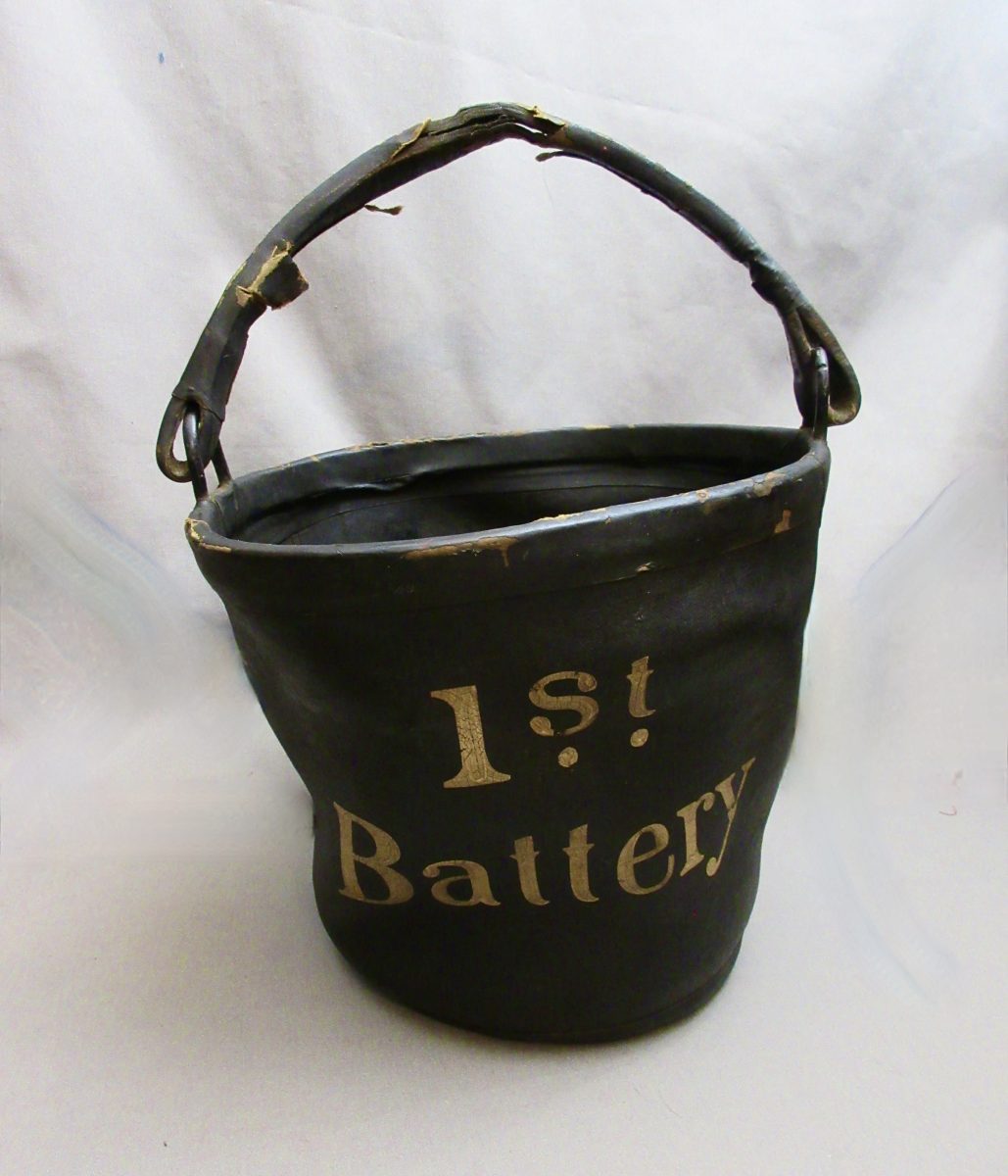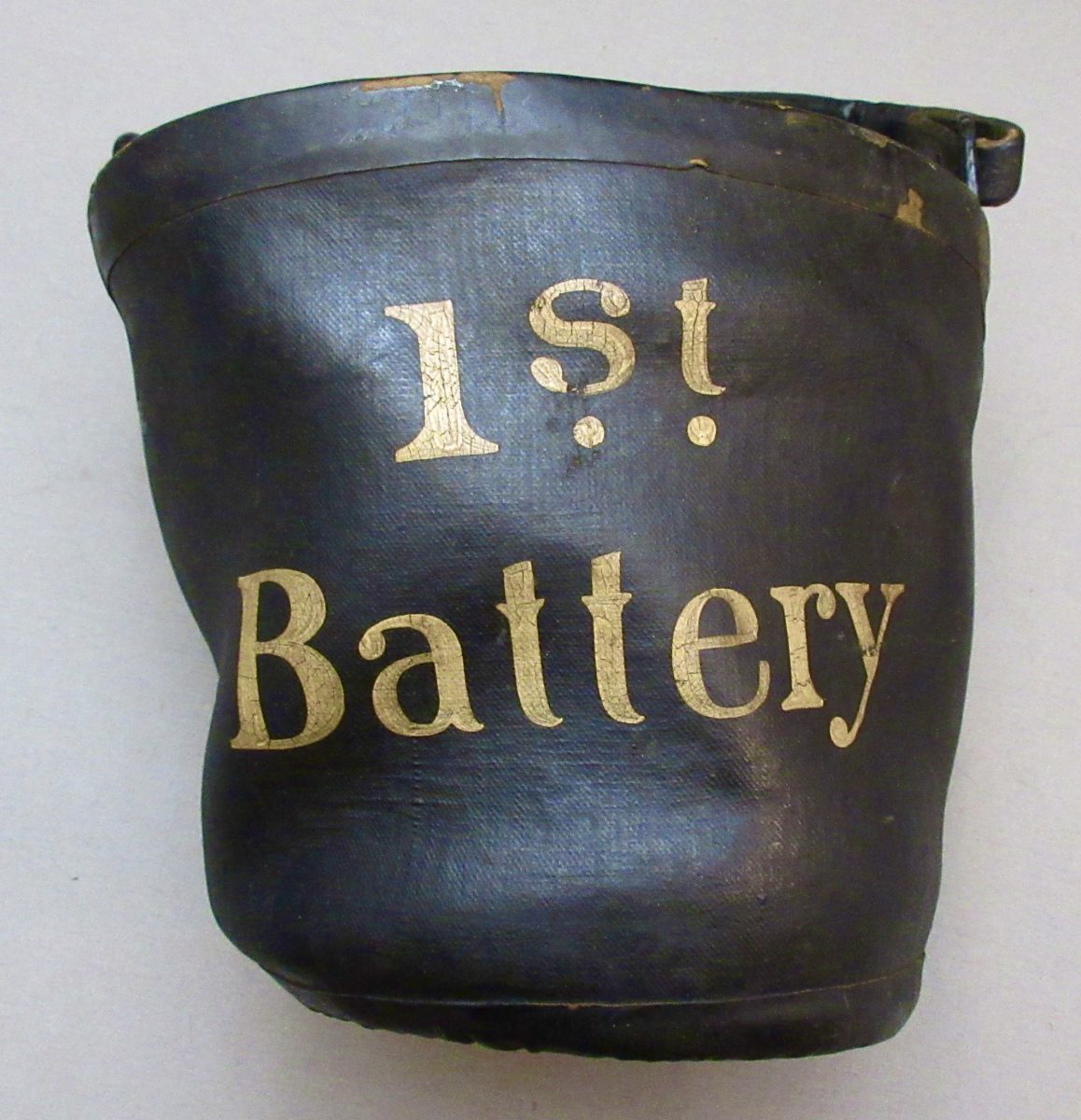 The period of this piece is just post Civil War, and used by an artillery regiment’s 1st Battery. Probably chosen for its durability. The paint is in white, and unquestionably original. Buckets similar to this were used, actually endorsed by Winfield S. Hancock as a captain, stating these held up much better against the rocks on the roads, or the heat or the cold, than the wooden types of oak or cedar. Wiard’s System of Field Artillery listed these buckets as part of the other equipments intended for a six gun battery for the caisson.
