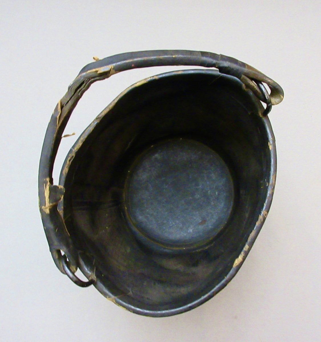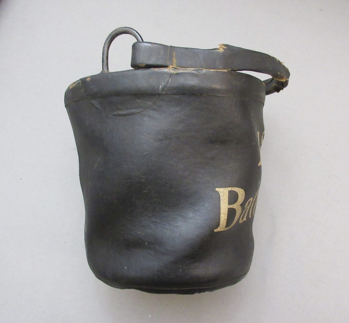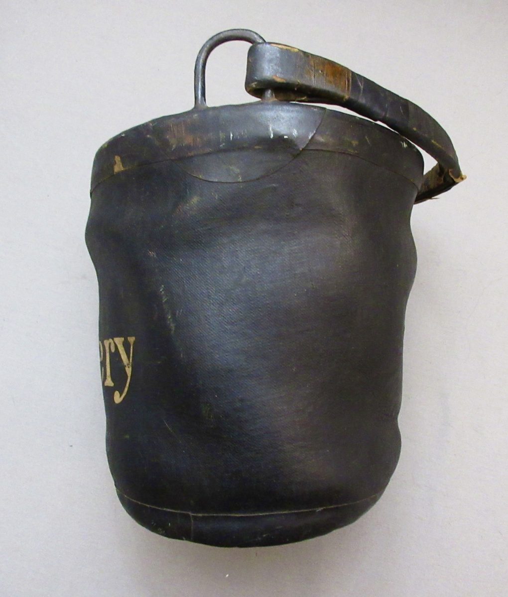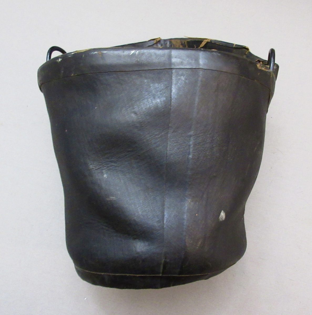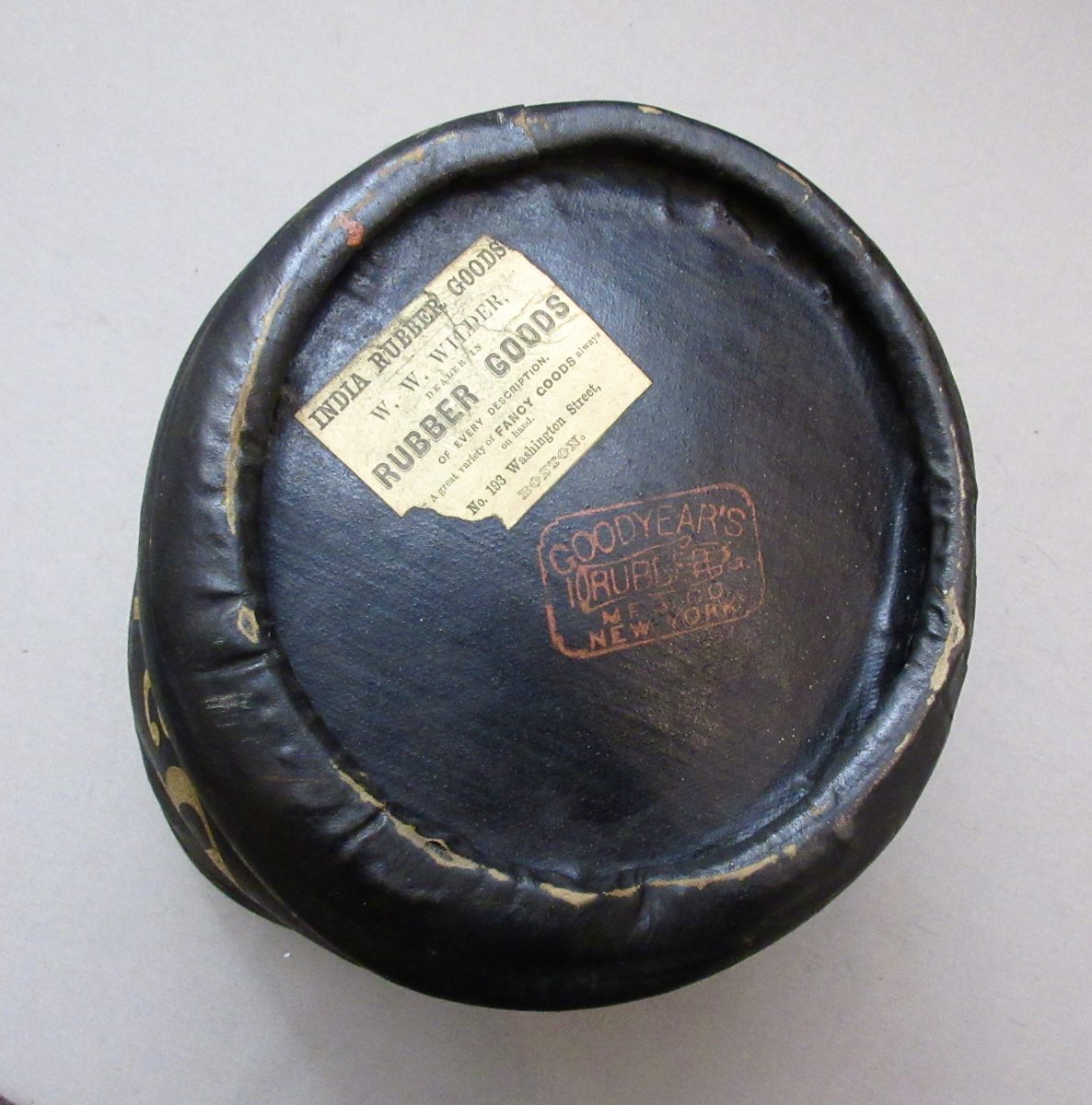 Goodyear’s India Rubber Bucket Use For Artillery Use “1st Battery,” marked on the bottom, “Goodyear’s India Rubber Glove Mfg, C. New York” and the attached paper label reads, “India Rubber Goods W.W. Wilder, Dealer In Rubber Goods Of Every Description…etc.. Boston..” Originally a bucket of about 9 inches high, made with pliable rubber, with attached handle attached to iron loops incorporated into the rim.