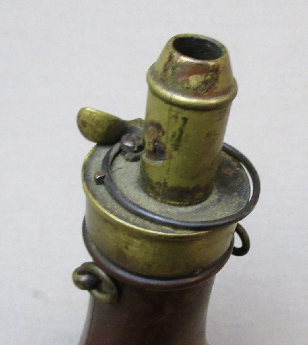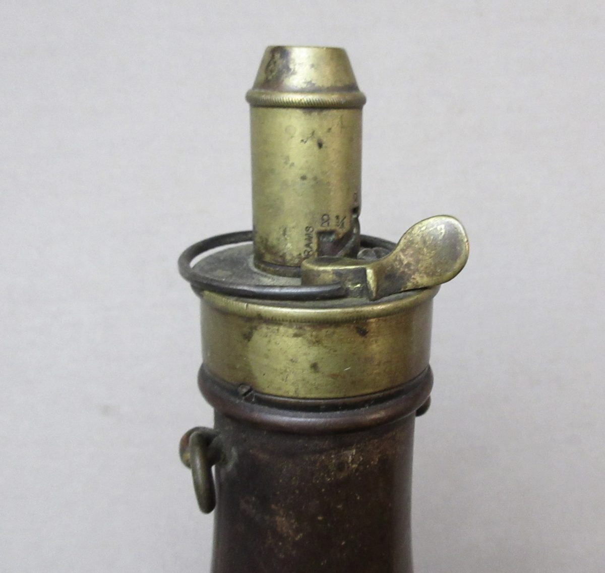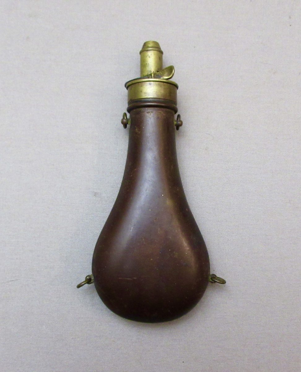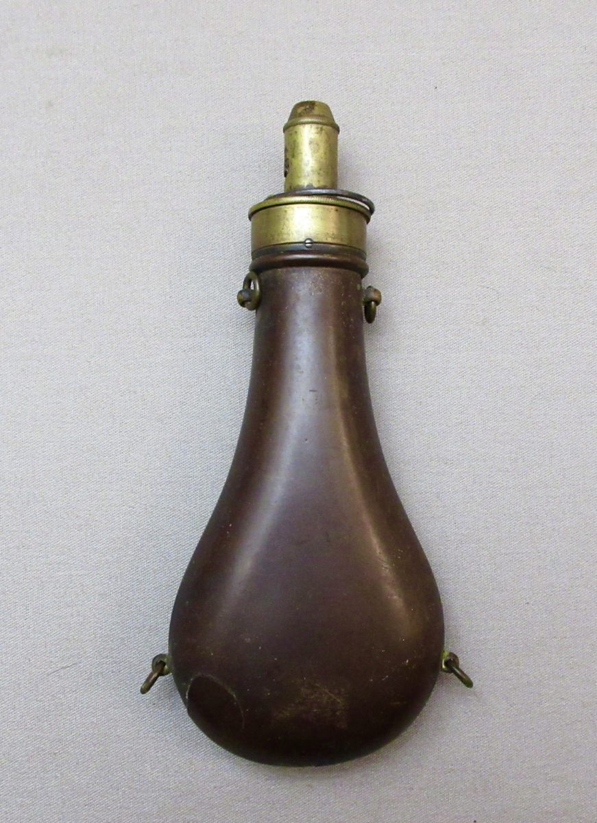 Hard Rubber Rifle Flask Made Circa 1850s.  Nearly 8 inches high, with the body having 4 brass mounted rings for sling. The brass spout and base is marked on the adjustable spout, “FRARY- BENHAM & CO.” The original spring is present, but a bit tired.