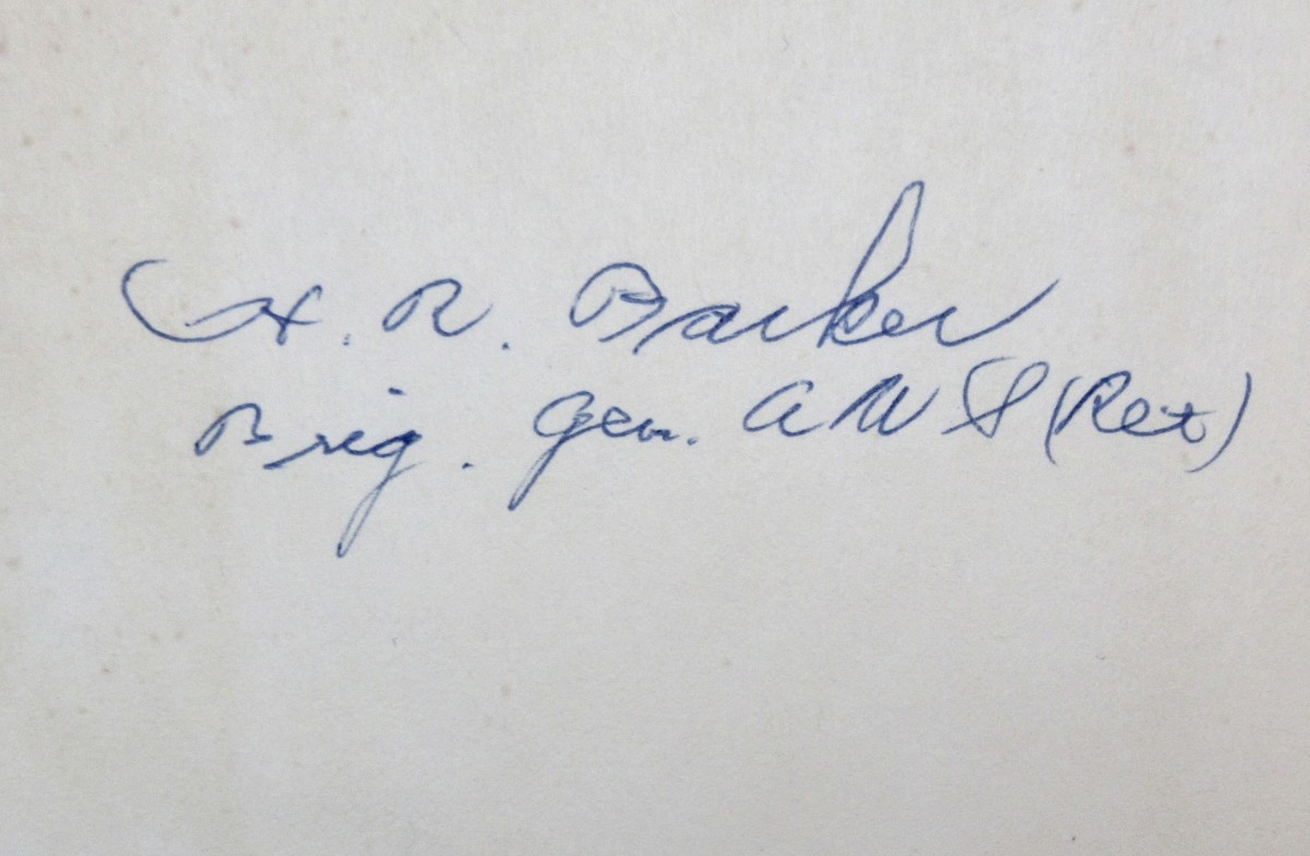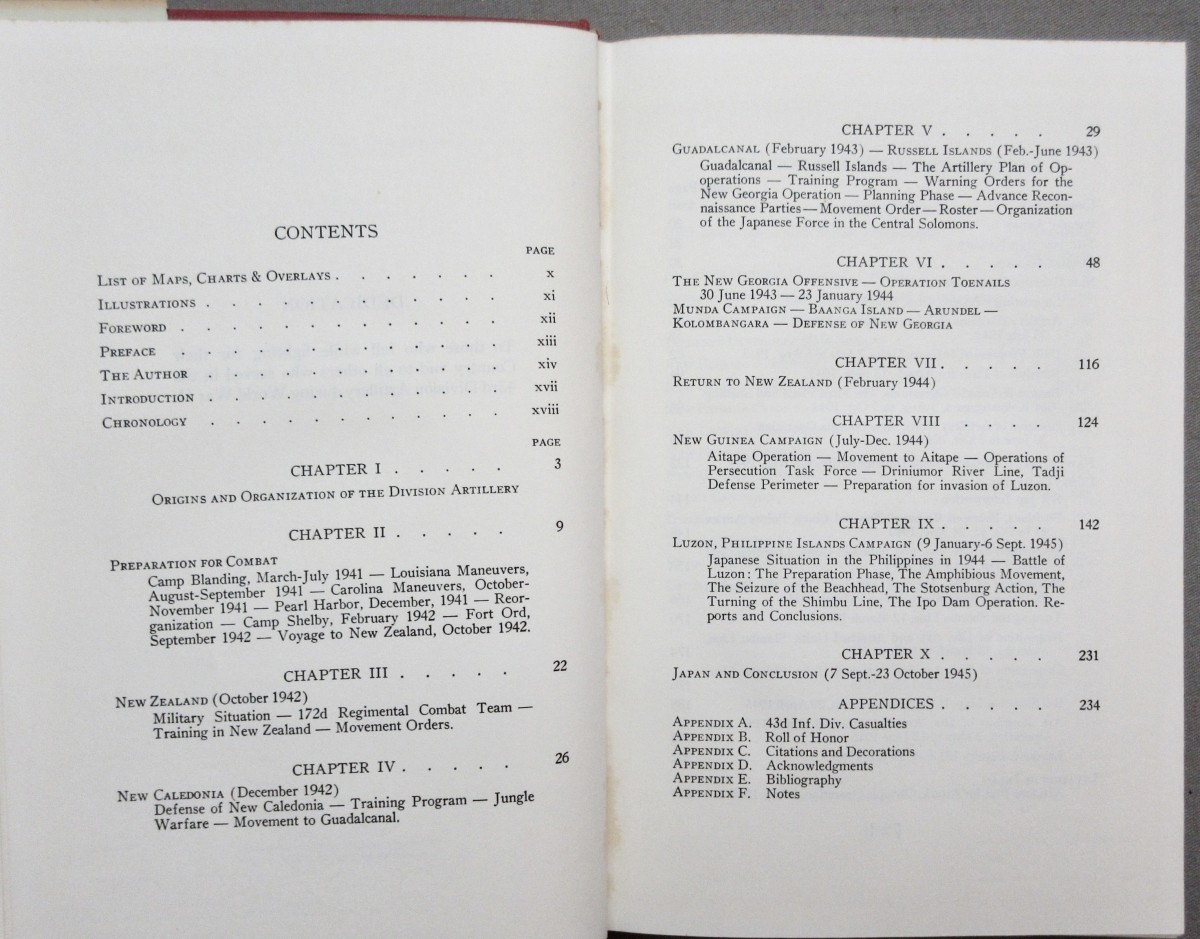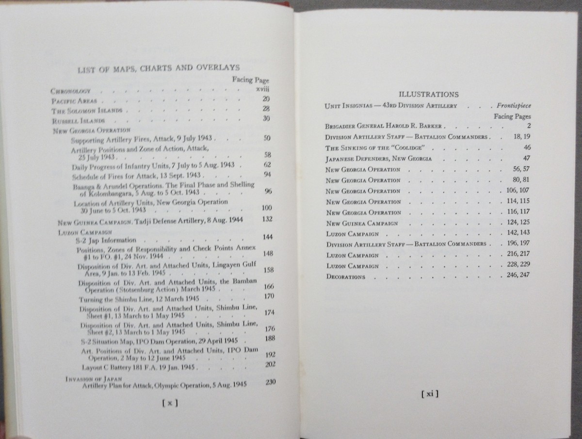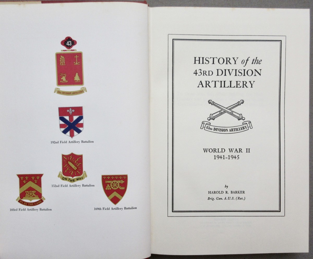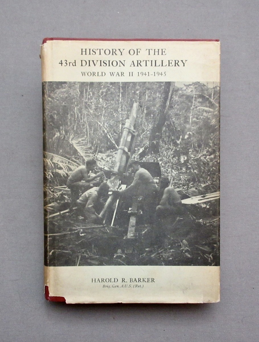 History Of The 43rd Division Artillery World War II 1941 – 1945 Signed by Commanding Officer. By Harold R. Barker, Brig. Gen. A.U.S. (Ret.), Printed Providence, R.I. With Dust Jacket, hard cloth covers, 251 pages, color illustration of unit insignia on facing page of Frontis, and more. Signed on inner flyleaf by “H.R. Parker, Brig. Gen. A.U.S. (Ret.)” His photo is featured prior to page 3.