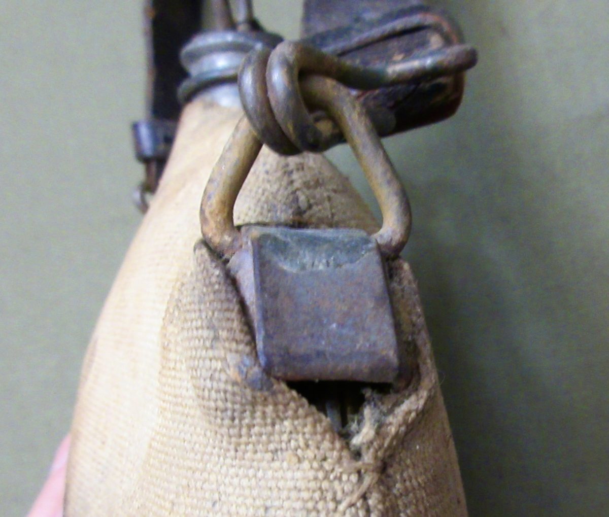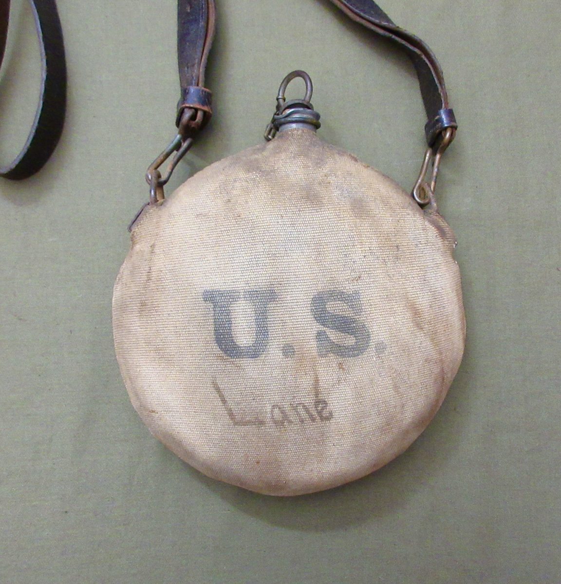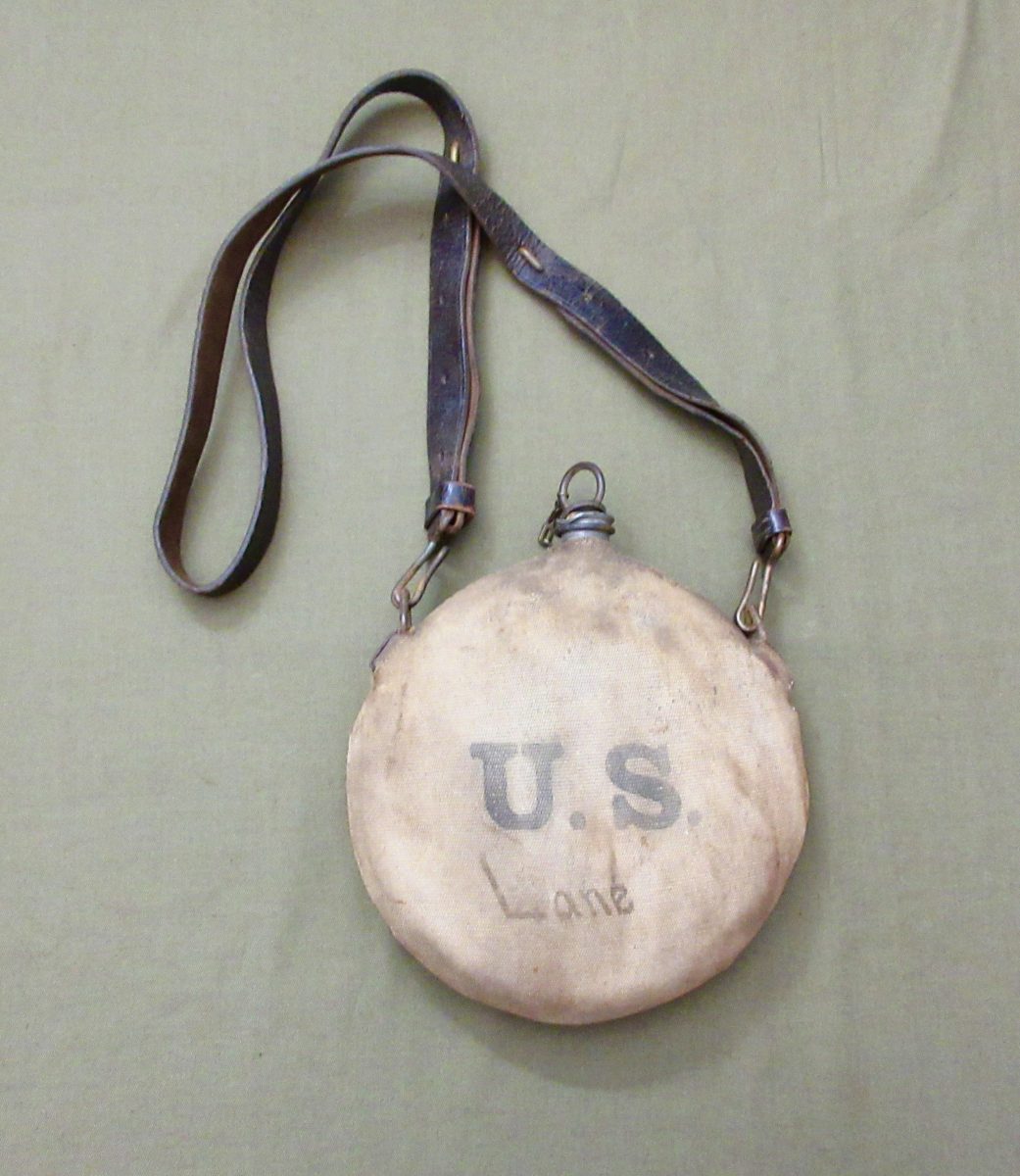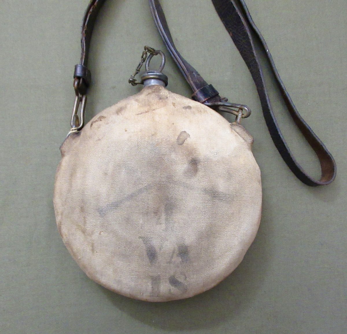 Model 1878 Modified Canteen. This canteen uses the Model 1858 canteen of 7 rings beneath the heavy canvas cover. with stenciled U.S. on one side, and 4th Virginia Infantry crossed rifle stencil with the soldiers equipment number “18.” This canteen may have been issued to the Virginia National Guard in the Spanish American War era. Identified to “Lane.”