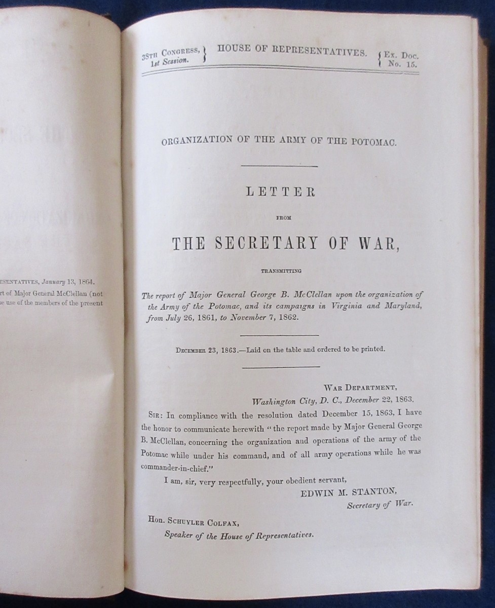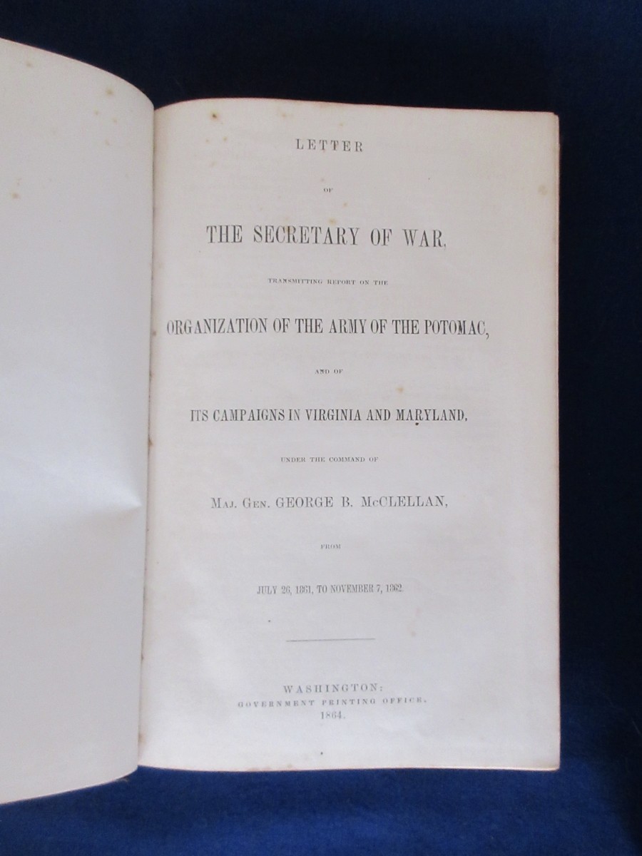 Letter of The Secretary Of War, Transmitting Report On The Organization of the Army of the Potomac- It’s Campaigns In Virginia & Maryland, Under The Command Of Maj. Gen. George B. McClellan From July 26, 1861, To November 7, 1862.  Washington: GPO, 1864. House of Representatives, 38th Congress 1st Session, Ex. Doc. No, 15.  Hard cloth covers, 242 pages,