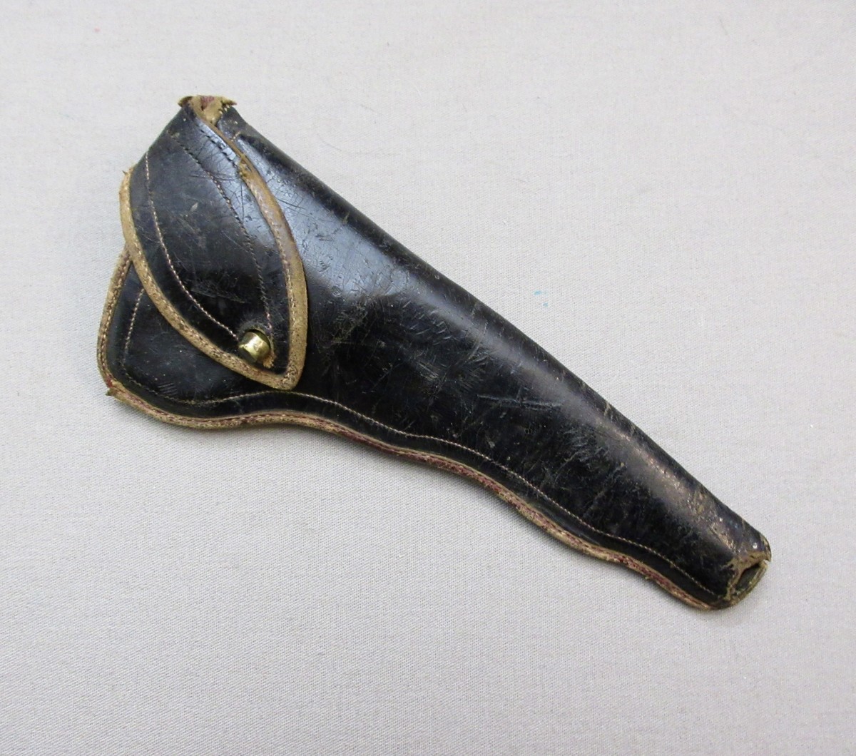 Quality Commercial Holster For a 5 Inch Colt Pocket Revolver, made of fine black bridle leather, and lined with tan colored chamois. A band of white thread is used to accent the lines of the body on the front panel and flag. A narrow belt loop is sewn on the body at the top, and held in place by a single rivet below.