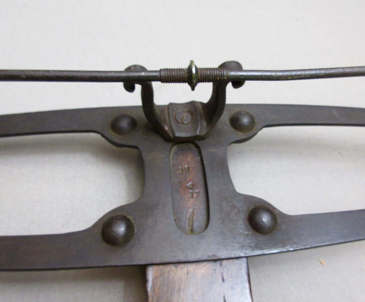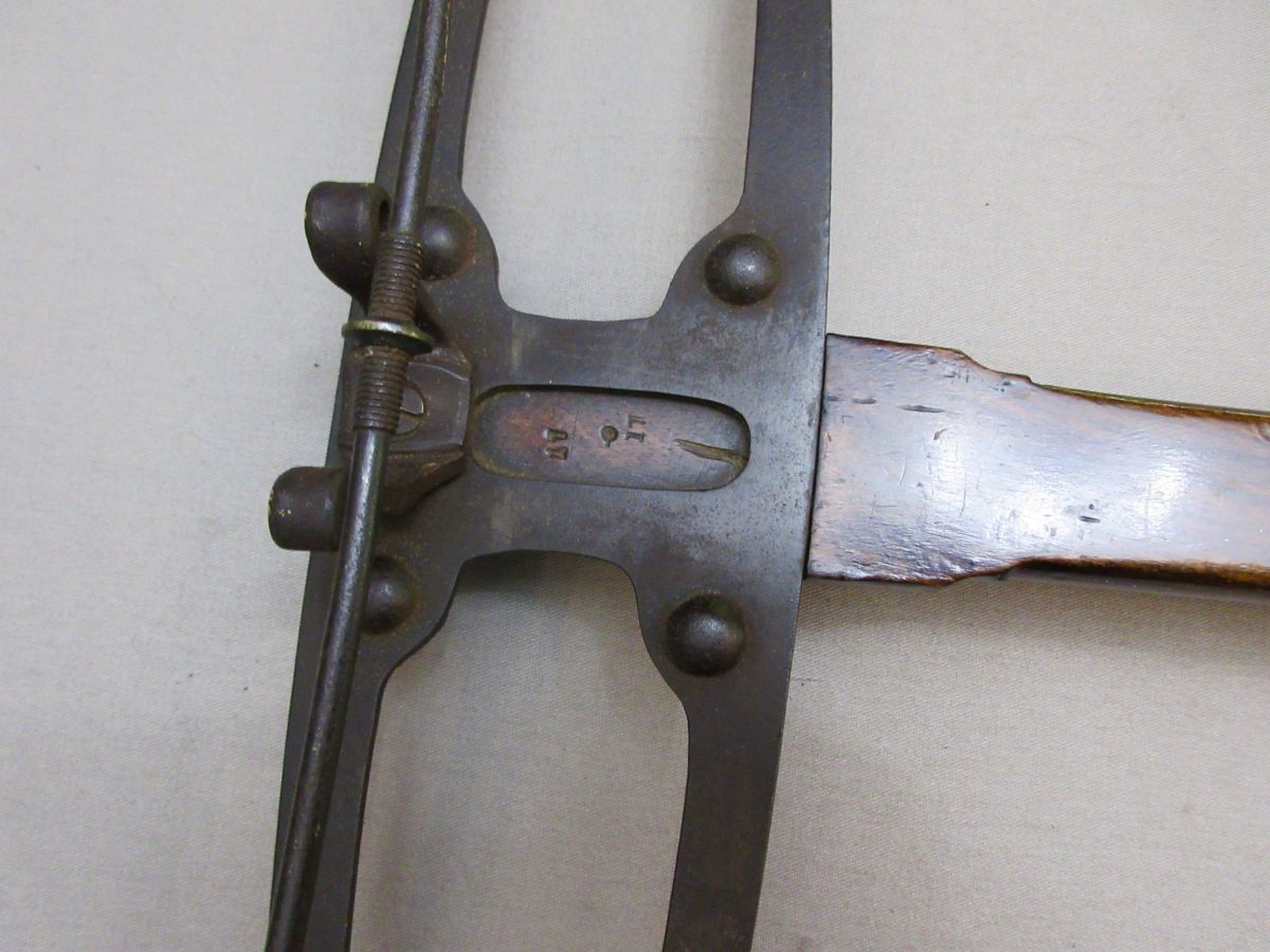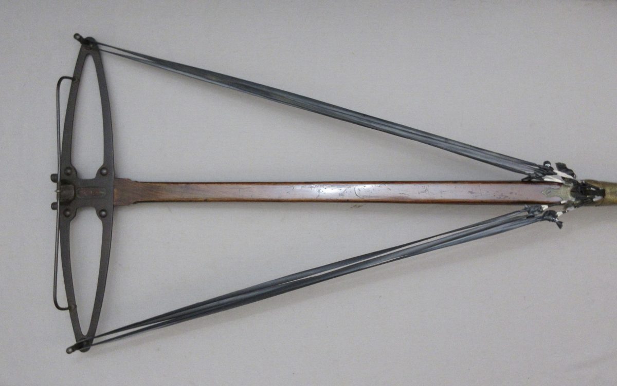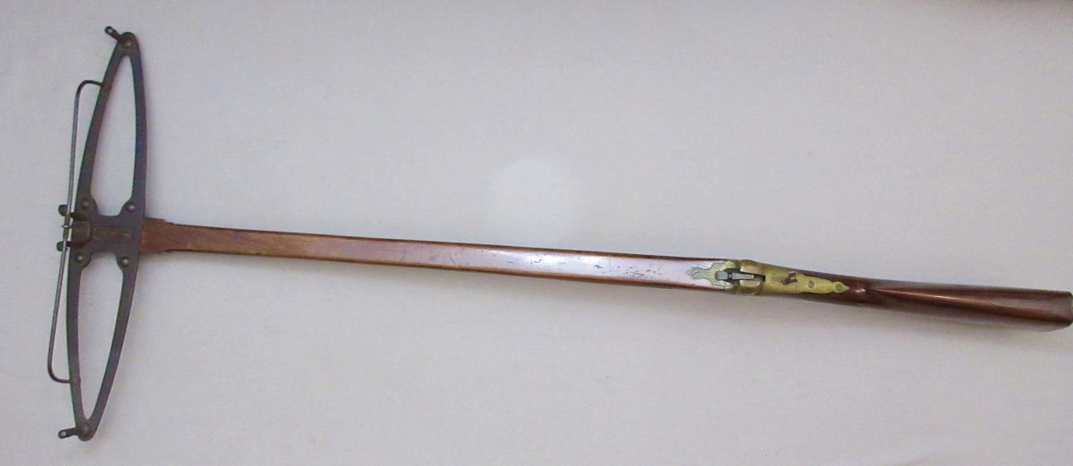 Richard E. Hodge’s Patented “Elastic Firearm” under British patent No.12,623 dated November 29, 1849. This is not a crossbow, but an elastic rubber or gutta-percha banded weapon that could create 400 pounds of force to propel a short spear, or thicker arrow perhaps for bore hunting, etc. Although the front end has the look of a cross bow, the metal section has a post on either end to accept the “rubber bands”, and then would be stretched out and placed behind the trigger. The upper support rod has incorporated a nut at the center with the ability to turn either way for windage, a rear sight is placed behind the trigger, and is adjustable. There is a rounded section on the front center section where the spear, etc would be placed.