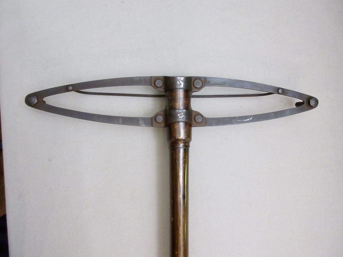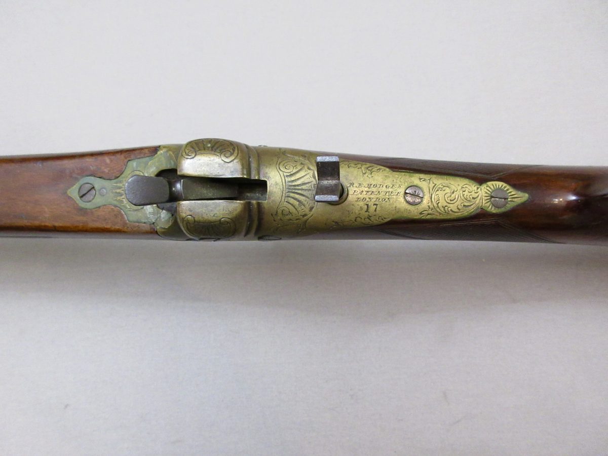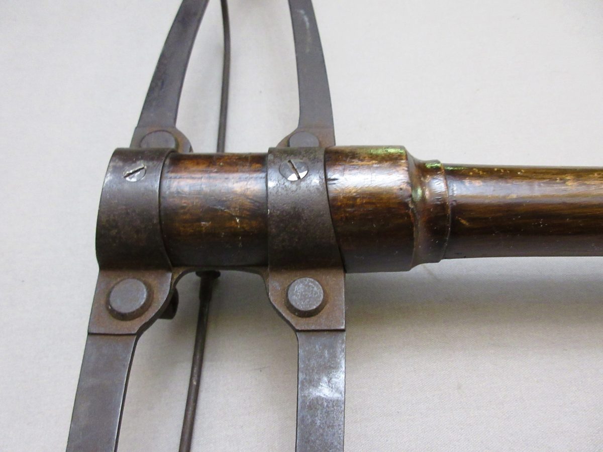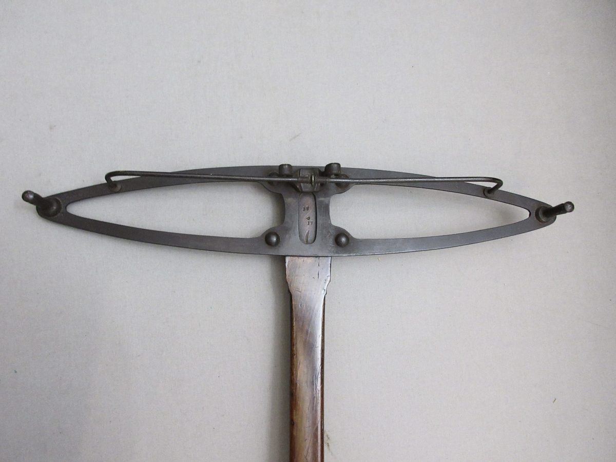 Richard E. Hodge’s Patented “Elastic Firearm” under British patent No.12,623 dated November 29, 1849. This is not a crossbow, but an elastic rubber or gutta-percha banded weapon that could create 400 pounds of force to propel a short spear, or thicker arrow perhaps for bore hunting, etc. Although the front end has the look of a cross bow, the metal section has a post on either end to accept the “rubber bands”, and then would be stretched out and placed behind the trigger. The upper support rod has incorporated a nut at the center with the ability to turn either way for windage, a rear sight is placed behind the trigger, and is adjustable. There is a rounded section on the front center section where the spear, etc would be placed.