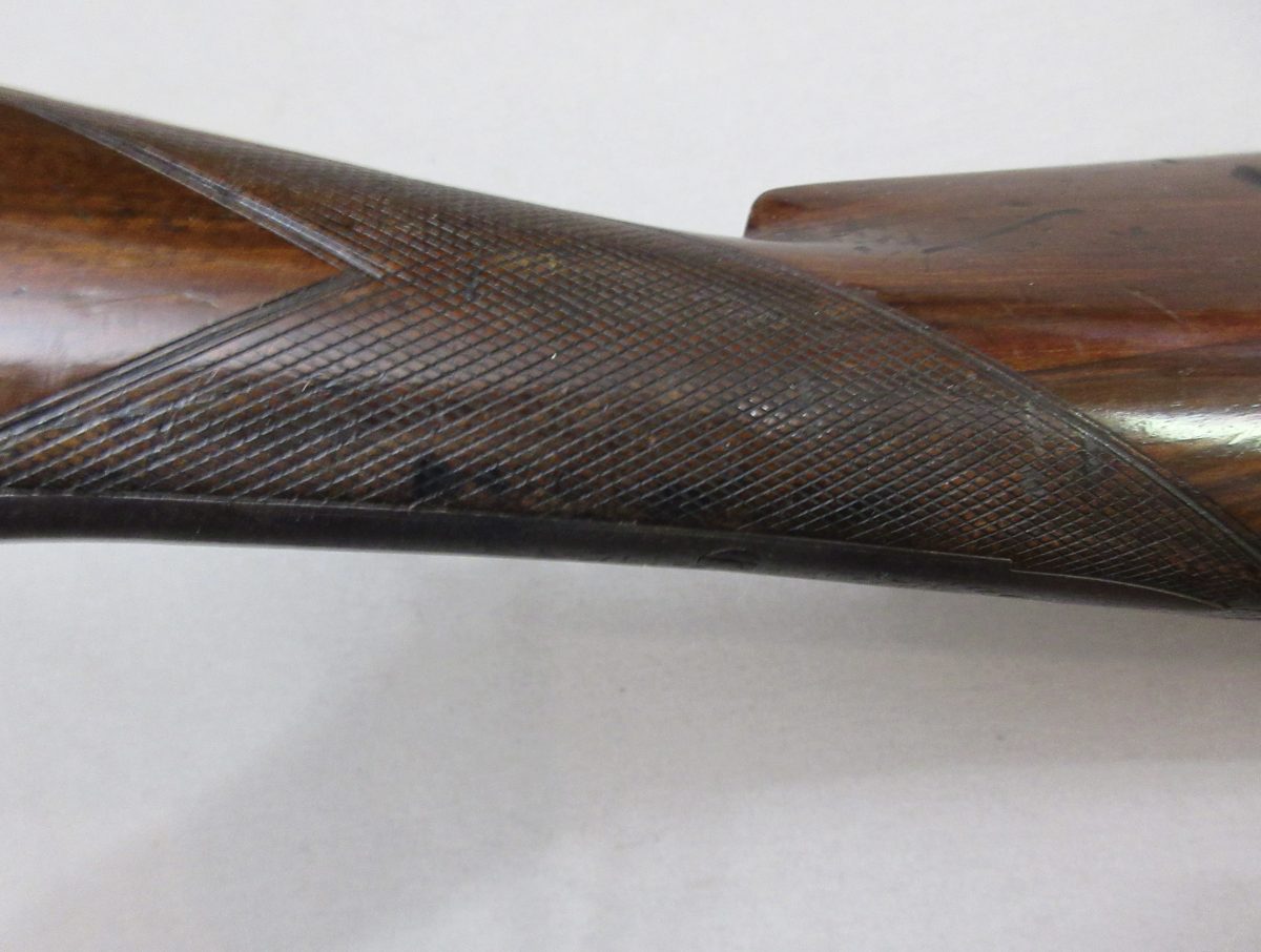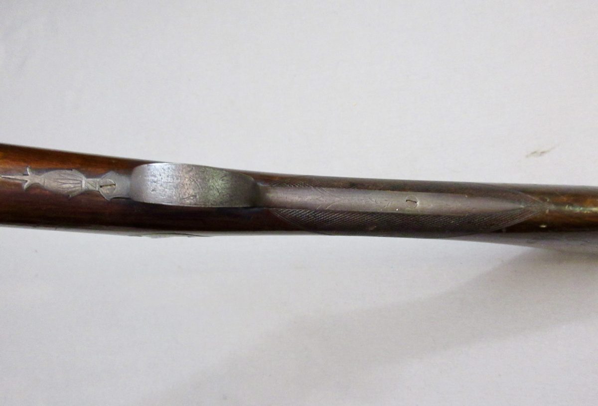 The walnut stock is checkered at the wrist, and has a protruding section of wood on the underside of the forend which is also checkered, allowing the hand to get a grip on the stock and avoid the rubber band flying forward when released. The trigger guard and butt plate are engraved iron, and just like standard long arms.