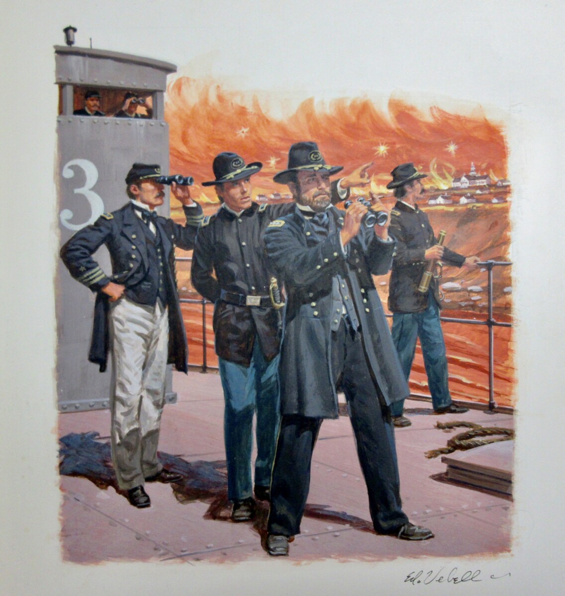 This scene of General Grant and staff aboard a monitor or gunboat on the Mississippi River, viewing the City of Vicksburg under siege just prior to its surrender. This signed work was done for the United States Postal Service, for a First Day Cover issued in 1990. The watercolor measures 13 x 17 inches approximate.