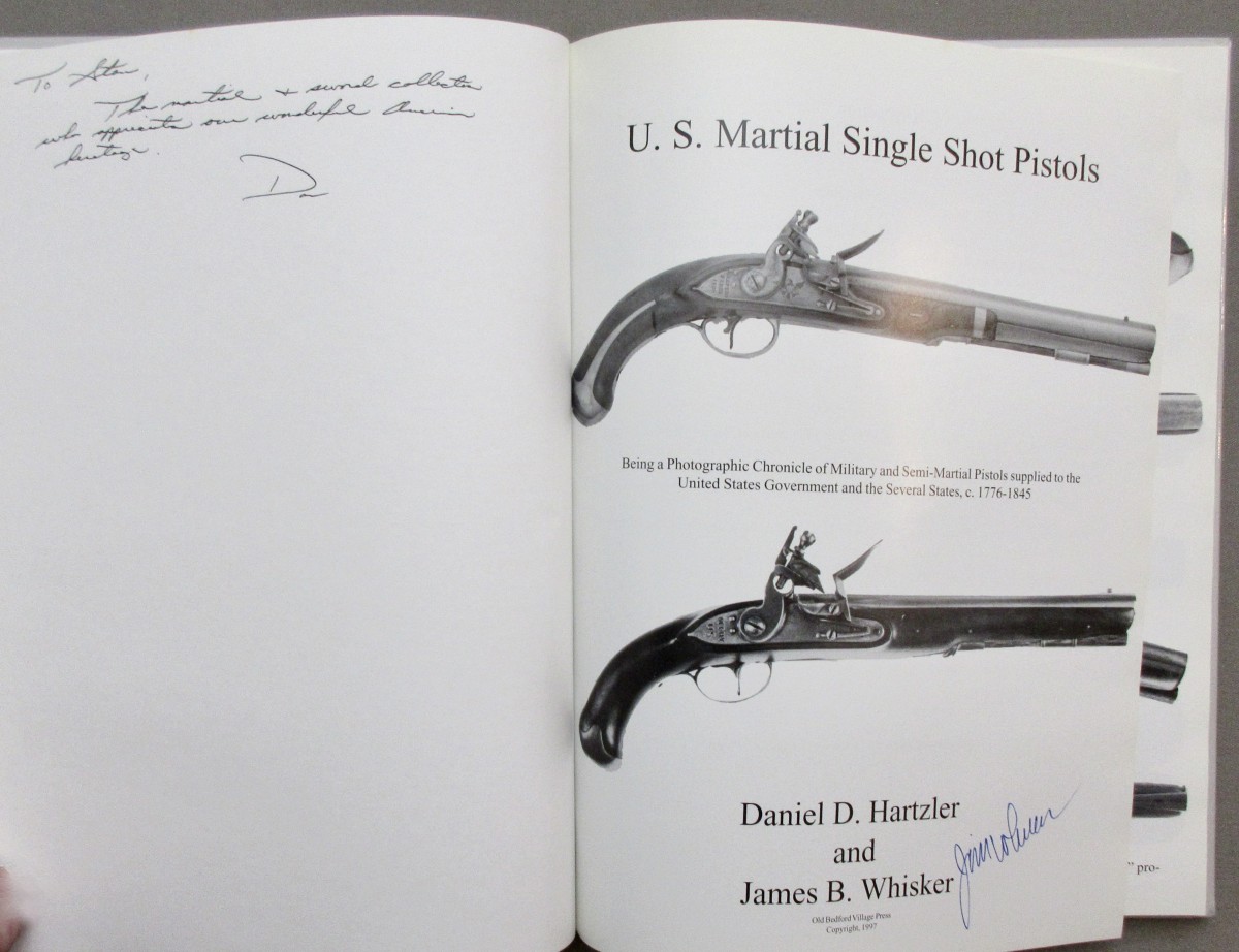 US Martial Single Shot Pistols Being a Photographic Chronicle of Military and Semi-Martial Pistols supplied to the United States Government and the Several States, C. 1776-1845 By Hartzler & Whisker, Old Bedford Village Press, 1997. Signed by Both authors. Hard cover, 128 pages, well illustrated.