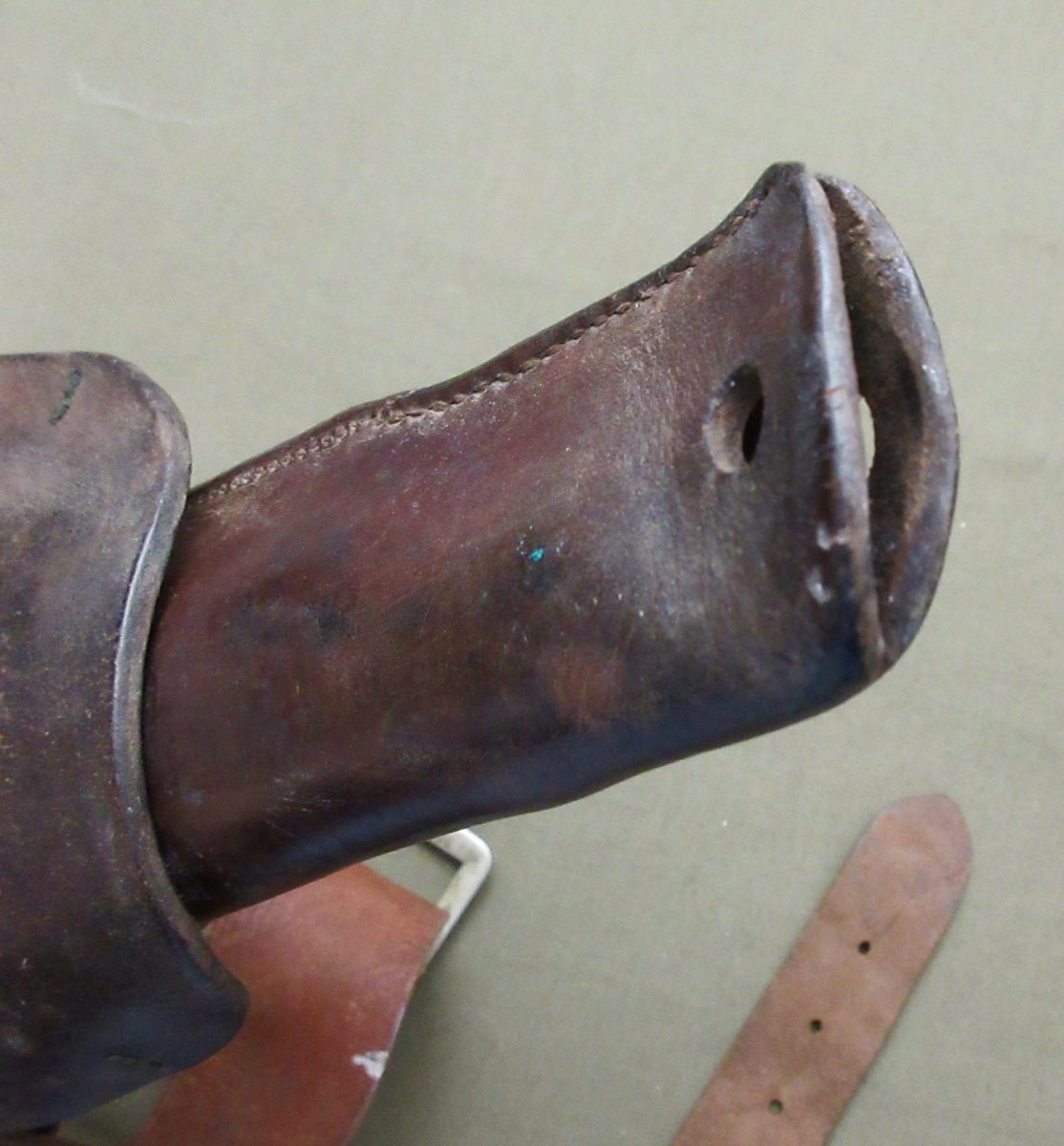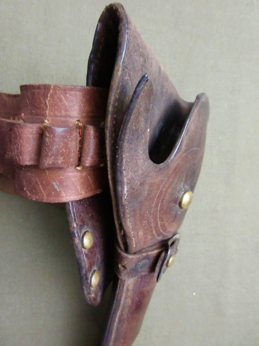 Western Holster & Belt Rig- Early 20th Century Catalog Stock. The holster is a simple pattern most likely sold through catalog sales at the turn of the century. The strap and buckle wraps around the body, and slides through an opening on the back panel that forms the belt loop. The strap is decorated with brass studs, and a small iron buckle. On the upper body his double ring design with a star at the center with another brass stud at its center. The bottom of the holster has no plug- never did, but instead is left open, rounded, and two holes are made for attaching leg tie-down straps. There is a catalog number stamped on the back. The back seam of the holster near the trigger guard area is open to just above the strap.