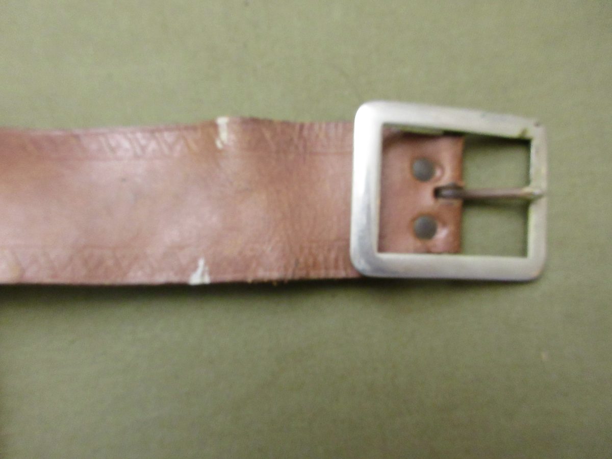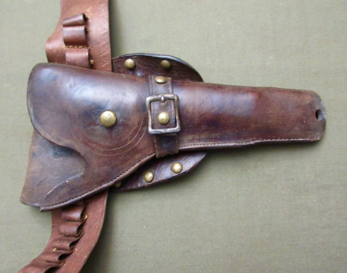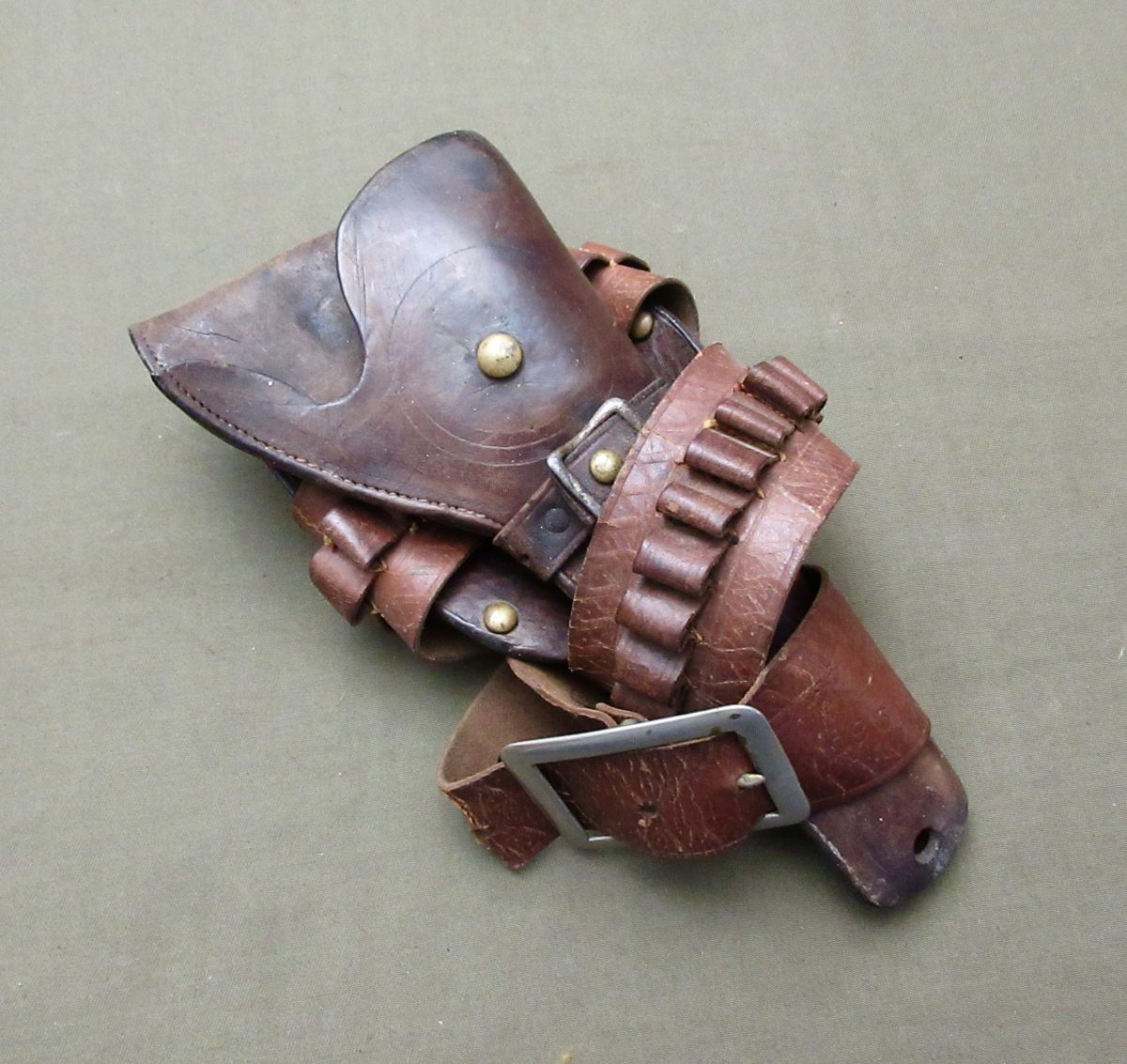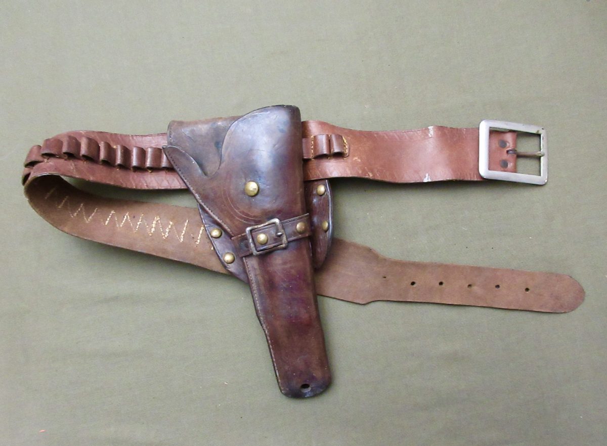 The belt has cartridge loops for what appears to be for a .36 caliber revolver. The nickel plated rectangular buckle has no marking. (3 inches long). The edges are embossed with a simple design with its catalog or model no “980,”and “44” for waist size.