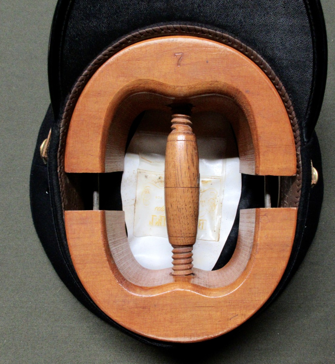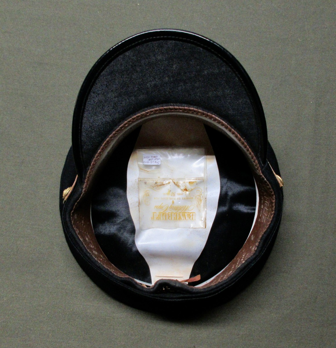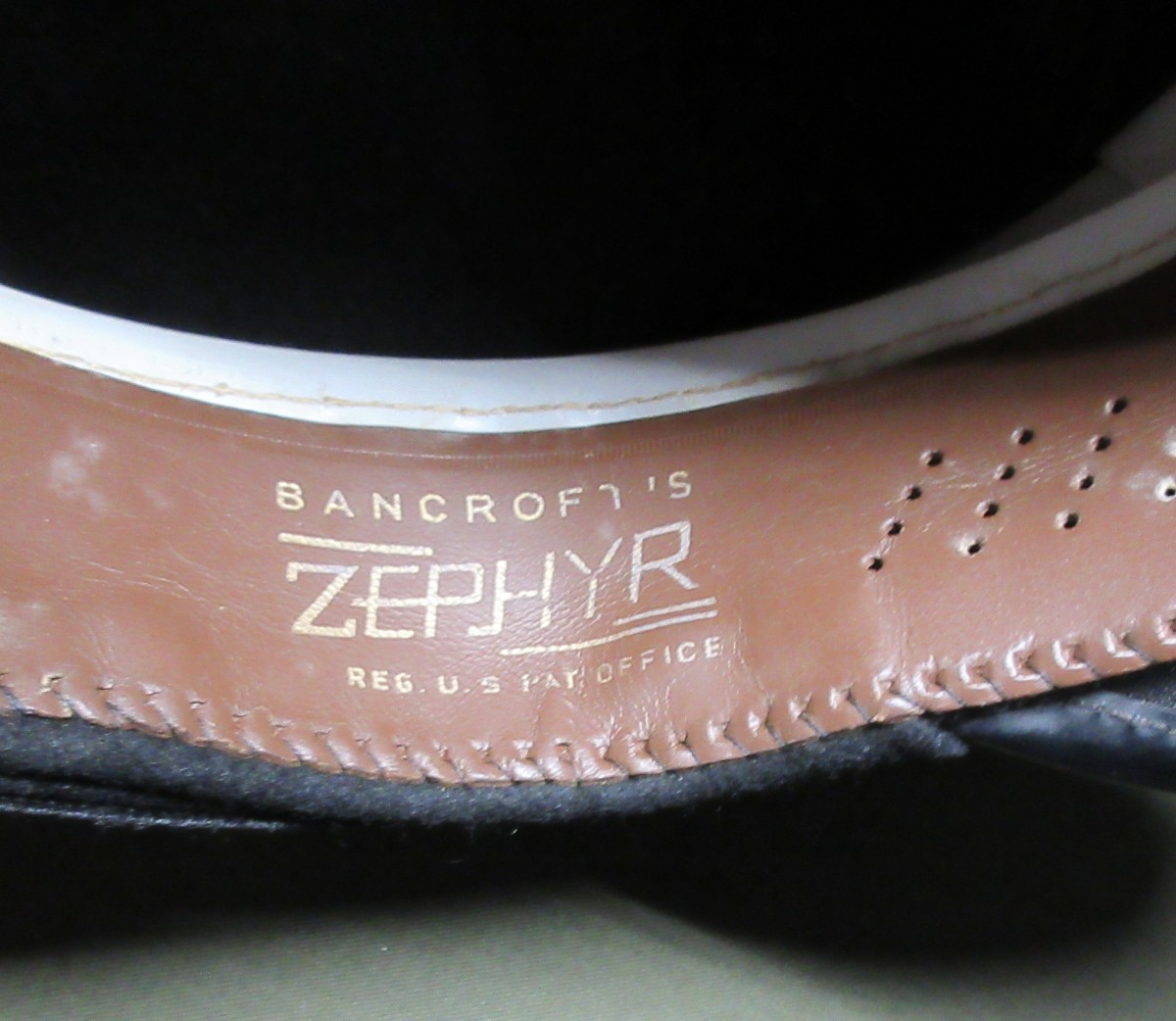 Made by Bancroft, marked “ZEPHYR” brand on sweatband. Rattan construction on base. The sweatband bunches up some, but when placed in a hat form, all correctly conforms to the right size of sweatband in relation to cap/eagle insignia mohair band. A few minor wear spots on mohair band, (see photos). No Id.