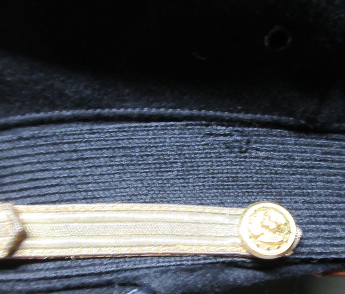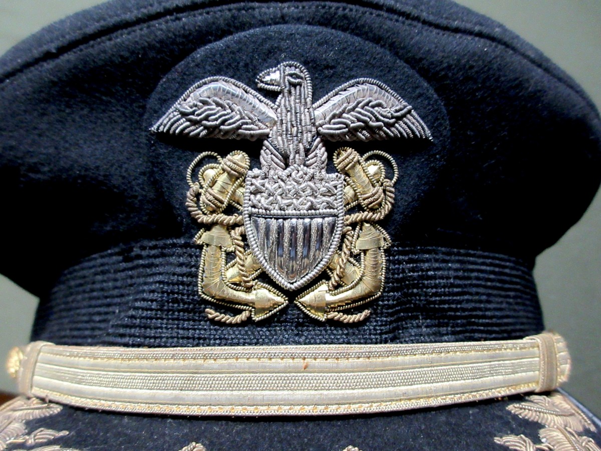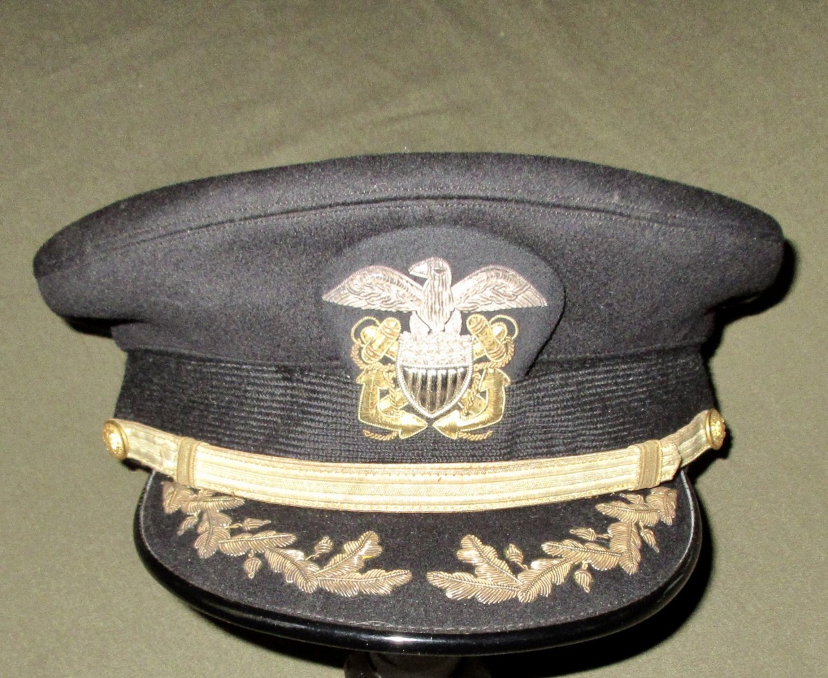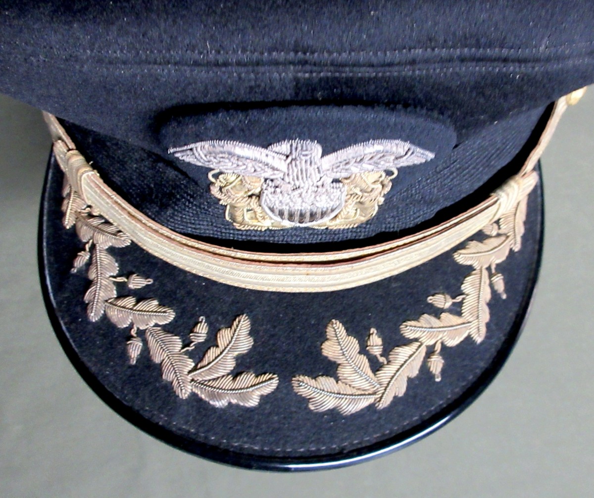 WWII Era USN Officer’s Blue Cover.  Commander/Captain grade with acorns and oak leaves on the visor.  Finely embroidered work also on the high relief eagle and crossed anchors in both gold and silver bullion.